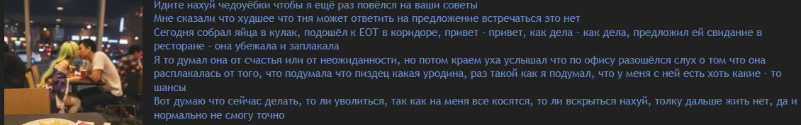 Хотя есть одна лапочка-няша-стесняша на работе, которая изредка ко мне заглядывает. Блин. Такая милаха скромная. Вот она похожа на аниме-девочку. В последний раз так миленько выглядила, в таком красивом платье была... Ещё ко мне на Вы обращается. Милаха.
