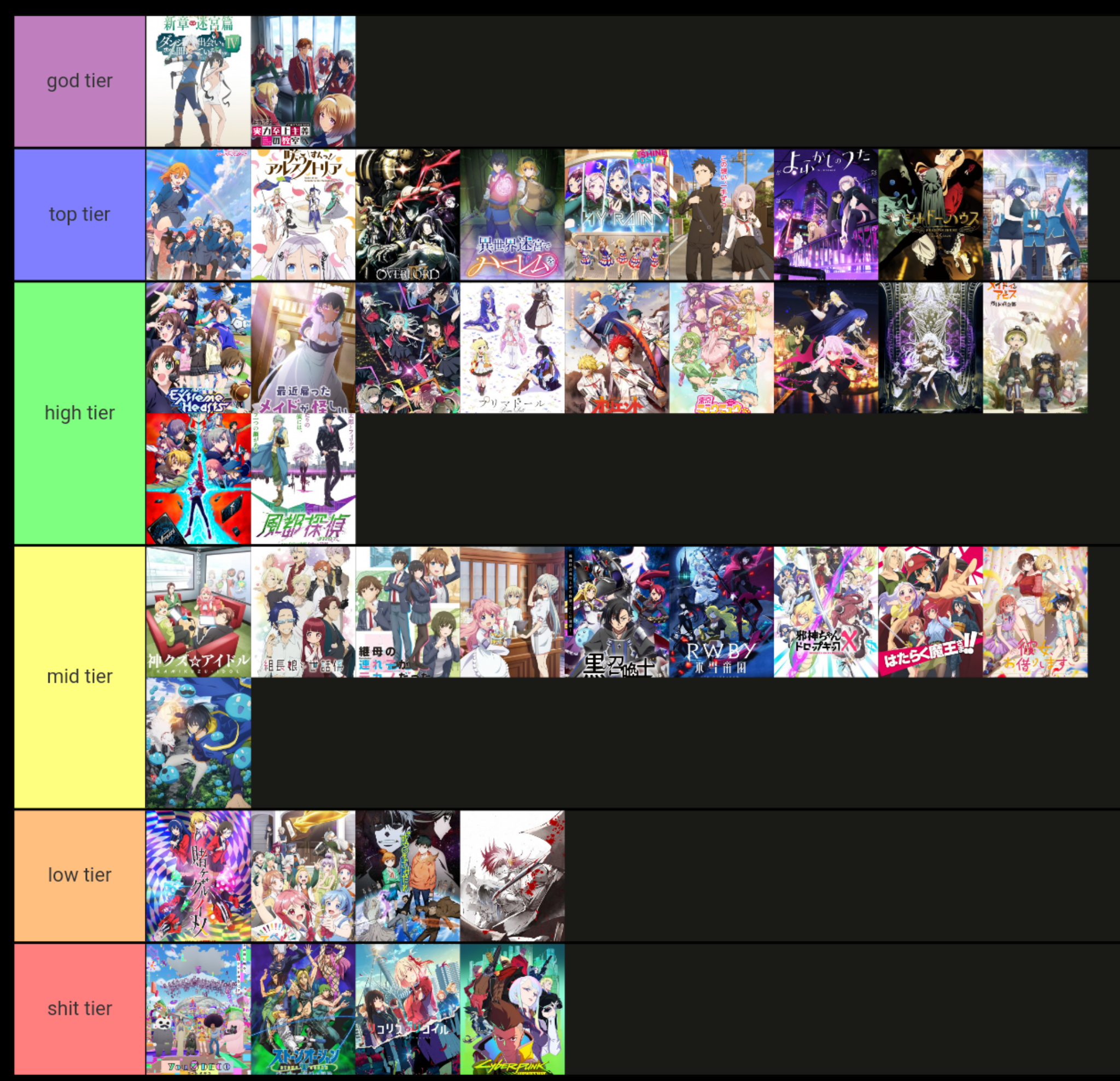 Убивашка в исекаях Боччи в слайсах Дом теней в нестандартных тайтлах Рендер в остросюжетках Оджисан в комеди / пародийных тайтлах Петя грил в эччи Футоку в фентези Учёные2 в романтике