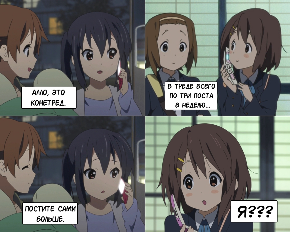 Q. Почему K-ON заслужил такую популярность? Ведь есть много других более интересных аниме про музыку. A. K-on - это аниме не про музыку. Его аудитория - 30-летние бородатые мужики, познавшие дзен, который и раскрыт в тайтле.