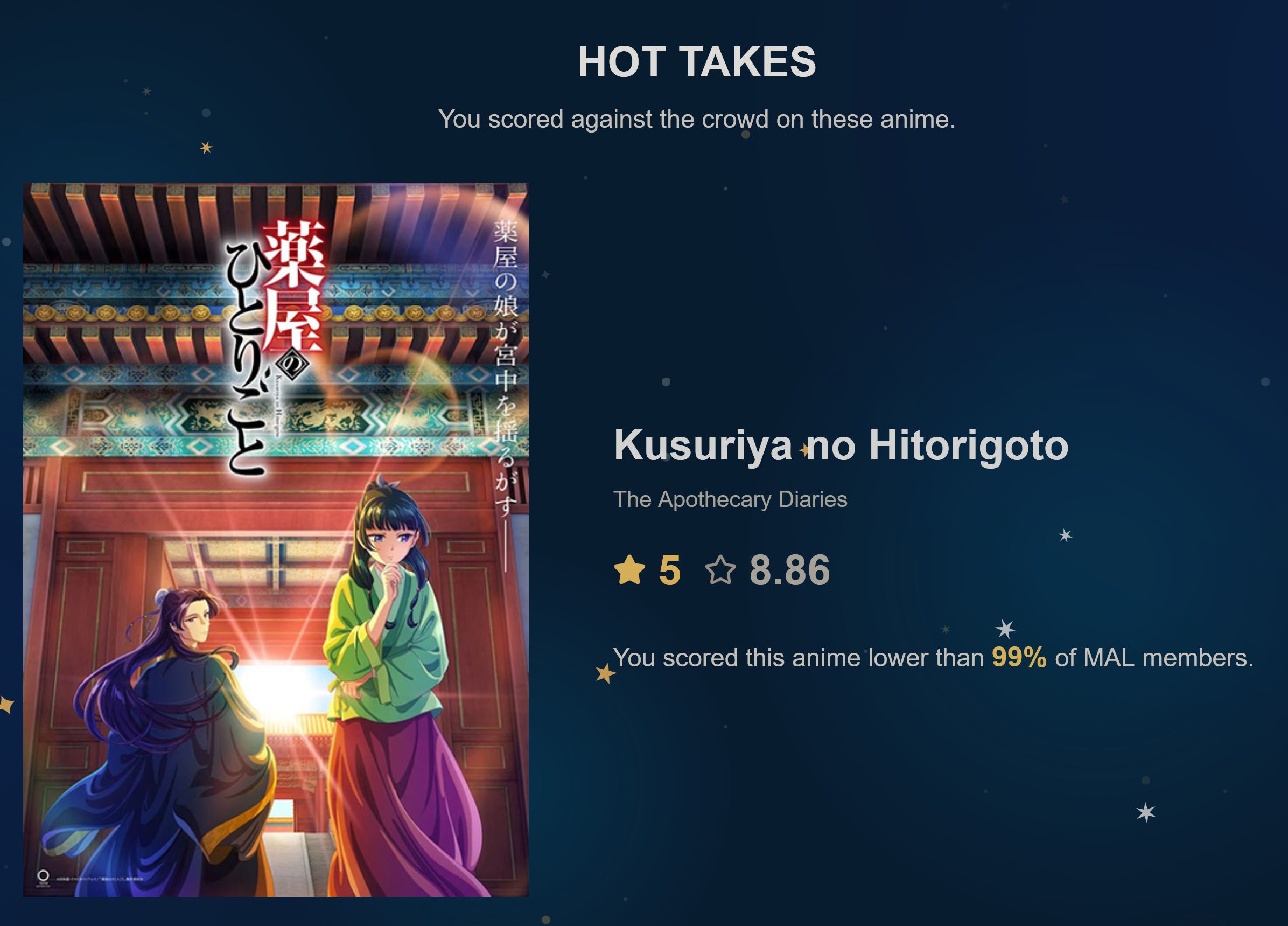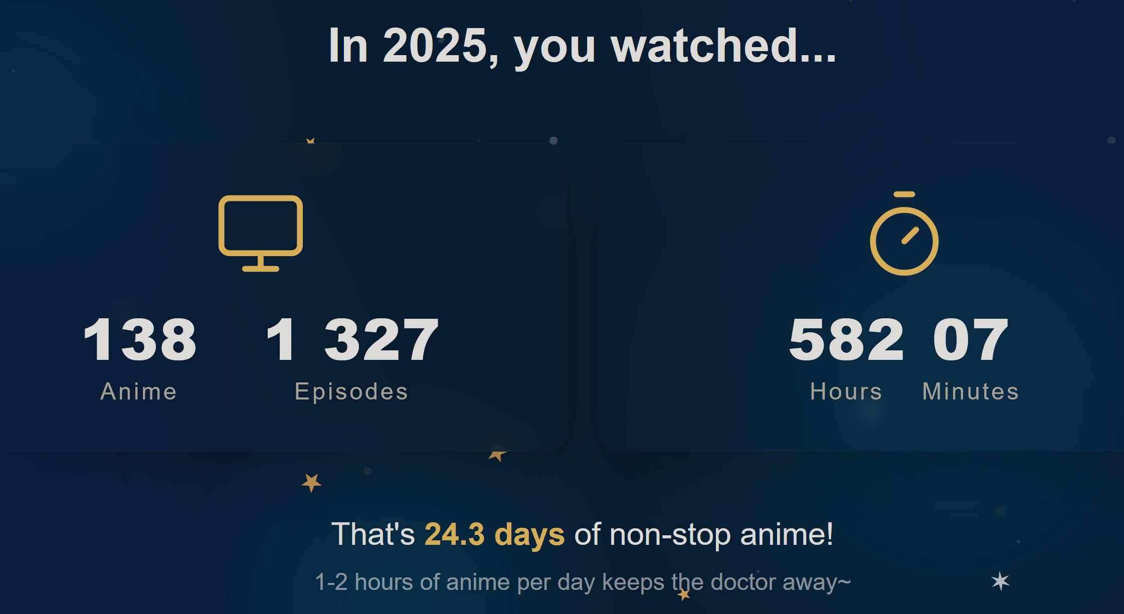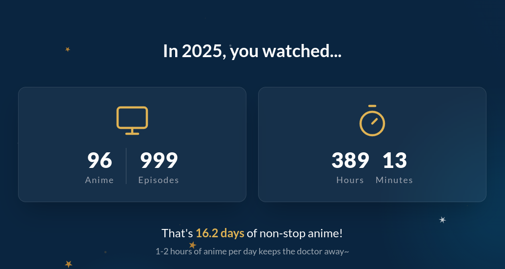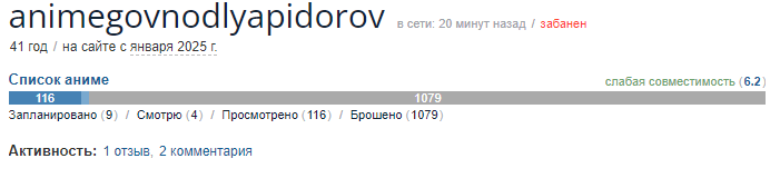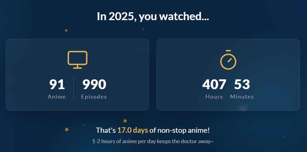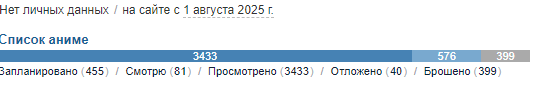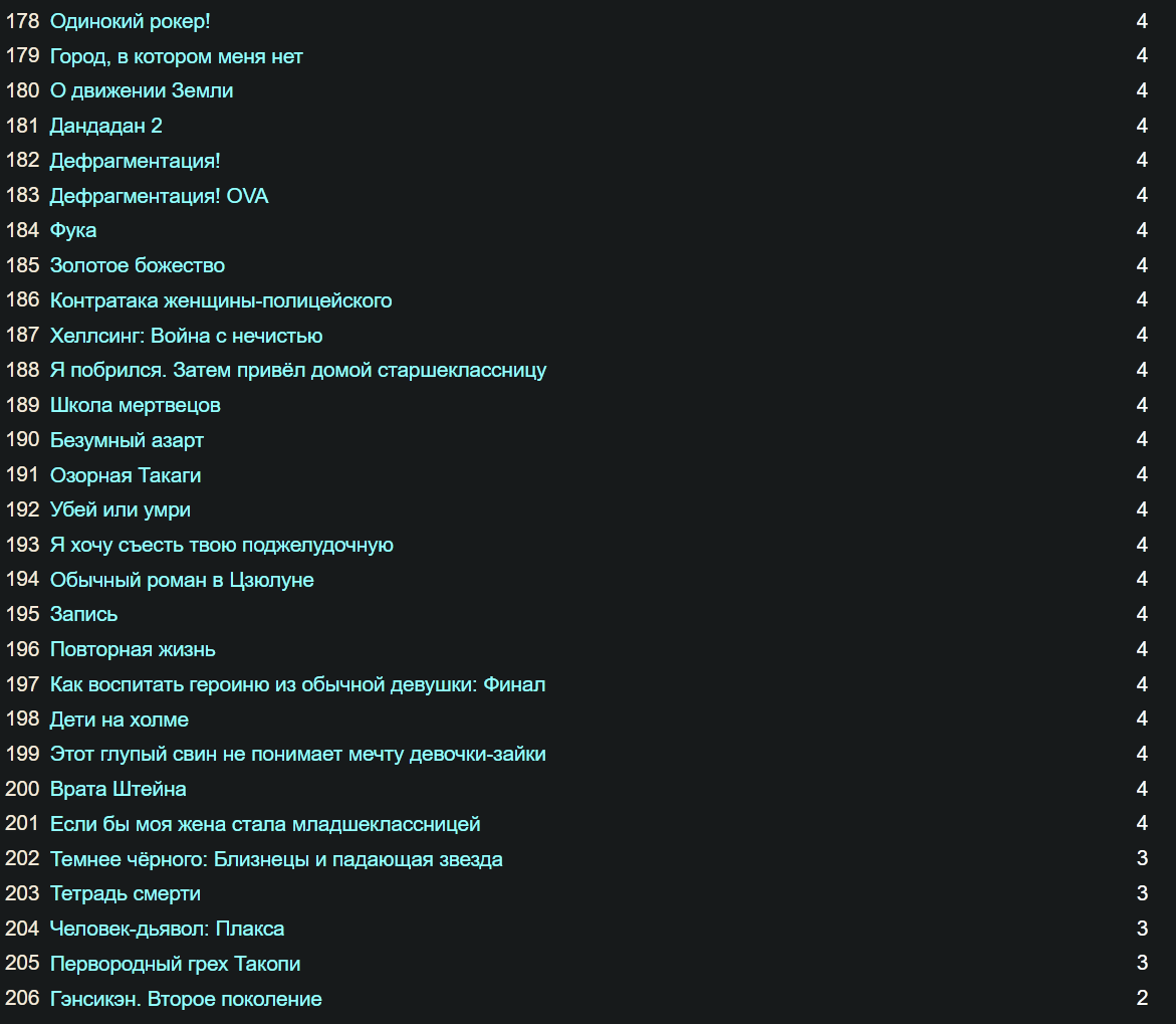 Я смотрю аниме большую часть своей осознанной жизни и не понимаю, как вообще преодолеть порог в 365 дней, я поставил себе такую цель не так давно и начал замечать, что ну очень долго это всё идет. Хотя я понимаю, что я не смотрю 24/7, и, возможно, играет роль, что я начал подмечать, сколько добавилось дней, но все равно ебать это долго стало всё. Сейчас у меня 220 дней, думаю над тем, чтобы таки осилить ванпис и покемонов, в детстве только моментами смотрел, но полностью никогда еще, считаю, что классику знать надо и когда-нибудь да доберусь до них. Но пока смотрю по 5-6 аниме с сезона и 2-3 каких-нибудь с прошлых сезонов.
