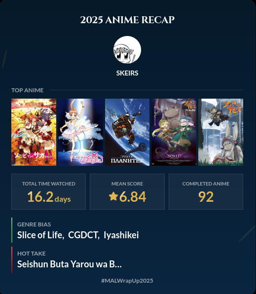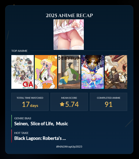 >>7959035 Смешно получилось, я теперь скипочмо. Такая статистика в основном за счет того, что прошлом году посмотрел наконец Нартуту и первые сезоны Блича и Хвоста феи. Во всех трех случаях после первых серий понял, с чем имею дело, и включил удвоенную скорость просмотра. Плюс, отпуск брал два раза по три недели из-за накопившихся дней, а отпуска просрал на аниме.
