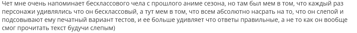 >Видимо настолько стыдитесь сучки Вот именно, что этого слизя я смотрел. Только отношение к нему поменялось от типикал исекая с имбой на гг до слайсо-исекая. Если смотреть его как слайс, то проблем никаких нет. Тихо мирно сидим пердим, че-то там куда-то раз за сезон сходили, дела поделали и дальше чилить