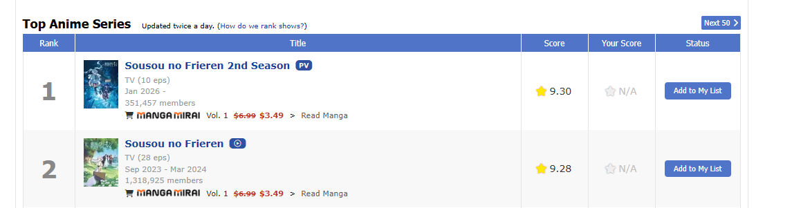 2024 #11: My Hero Academia #10: Bang Brave Bang Bravern #9: Dead Dead Demon's Dede Dede Destruction #8: Re:Zero #7: Toooooo Many Losing Heroines #6: The Dangers In My Heart #5: Girls Band Cry #4: Orb. On the Movement of the Earth #3: Delicious in Dungeon #2: DanDaDan #1: Look Back