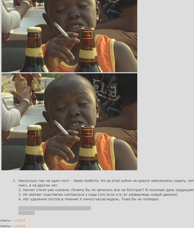 Несколько пик на один пост - такая поебота. Из-за этой хуйни на крауте невозможно сидеть, теперь и на харкаче тоже не посидишь. Может лучше настроить это фигню чтобы на одной доске аля /g/ можно было прикреплять несколько пикч, а на других нет. 2. Насчет стиля уже сказали. Почему бы не запилить все на бутстрап? Я понимаю дань традициям, дух старых борд и прочья малафья, но, блджад, 2014 год на дворе, а дизайн как будто из СССР. 3. Не хватает подстветки синтаксиса у кода (это если и в /pr развернешь новый движок) 4. Нет удаления постов в течение Х минут/часов/недель. Тоже бы не помешал.