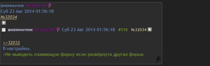 Абу, если ты прислушиваешься к мнению посетителей захваченной тобой ракоборды, то вот мои предложения по мере их важности на мой взгляд. 1) Сделай нормальные (т.е. привычные, как было) отступы между контентом поста и его границей. 2) Верни старые междустрочные интервалы. 3) Верни старое обтекание изображения текстом: изображение справа - текст слева, т.е. убери это новое обтекание вообще. 4) Сделай название прикрепленного изображения и его размера на одной строке. 5) Уменьши шрифт ссылки на ответ поста, которая >>post_num