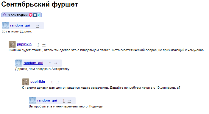 Нахуй это говно, надо перекатываться на борду с реально свободным общением. А то харкач хуже ычана стал. Отдельное спасибо за мочерацию и баны в крымотредах. Ананасы, есть идеи, куда можно мигрировать? Раньше хотя бы нульч был.