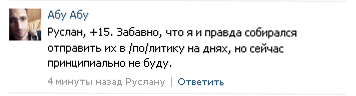 Господа, это всё, конечно, очень увлекательно. Но это действия отдельных модераторов. Да, они должны быть наказаны. Вы правы. Но ведь в таком случае и куклоёбок, ограничивающий нашу свободу слова, тоже должен быть наказан. Например, блокированием его тоталитаристского скрипта. Так что Абу всё сделал правильно, он молодец.