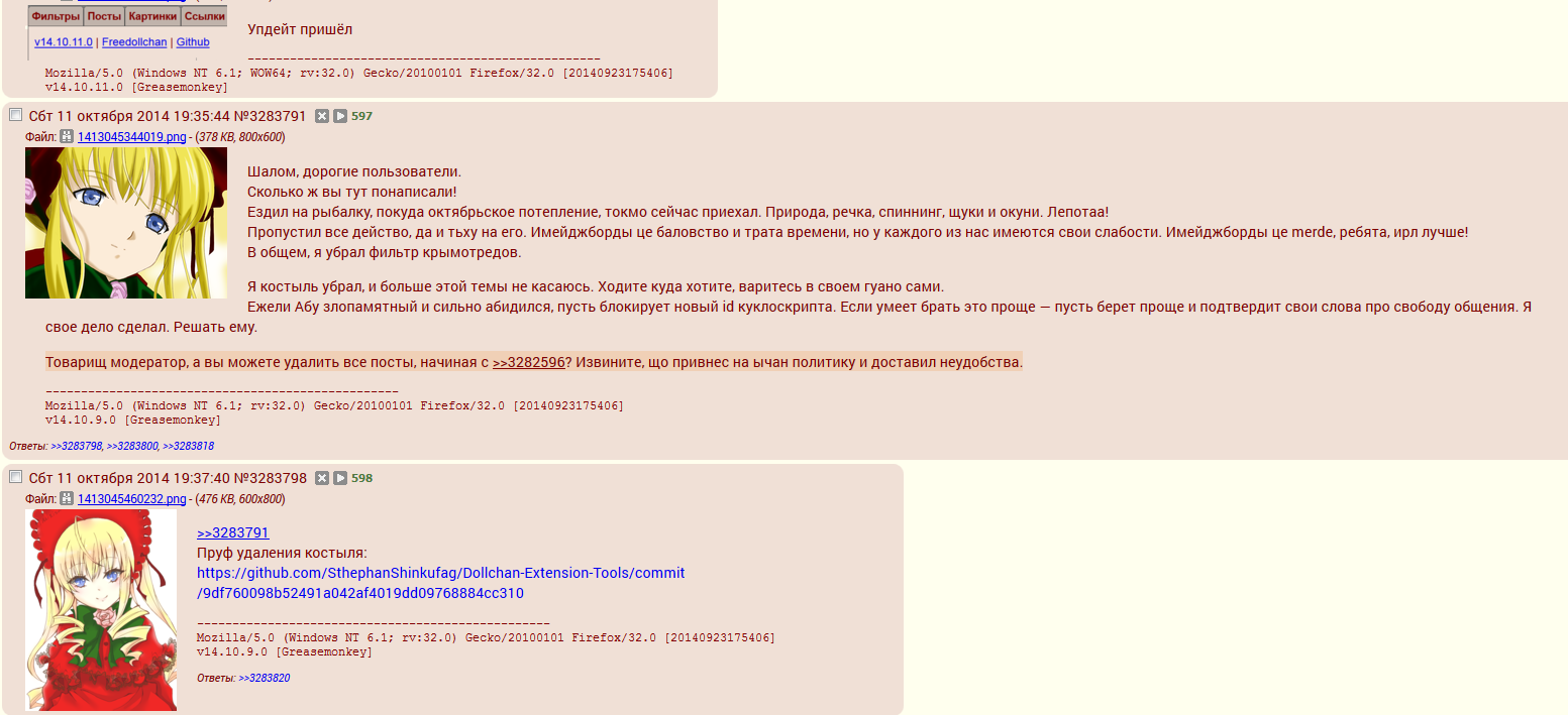 Думаю, большинство уже в курсе, что работа куклоскрипта была заблокирована из-за ниндзя-фикса Степана, который вырезает все треды в /b/, где содержатся производные от "Крым", "Новороссия", "ДНР", "ЛНР". Автор скрипта не скрывает того, что он собирается и в дальнейшем вырезать контент, который ему не понравится.