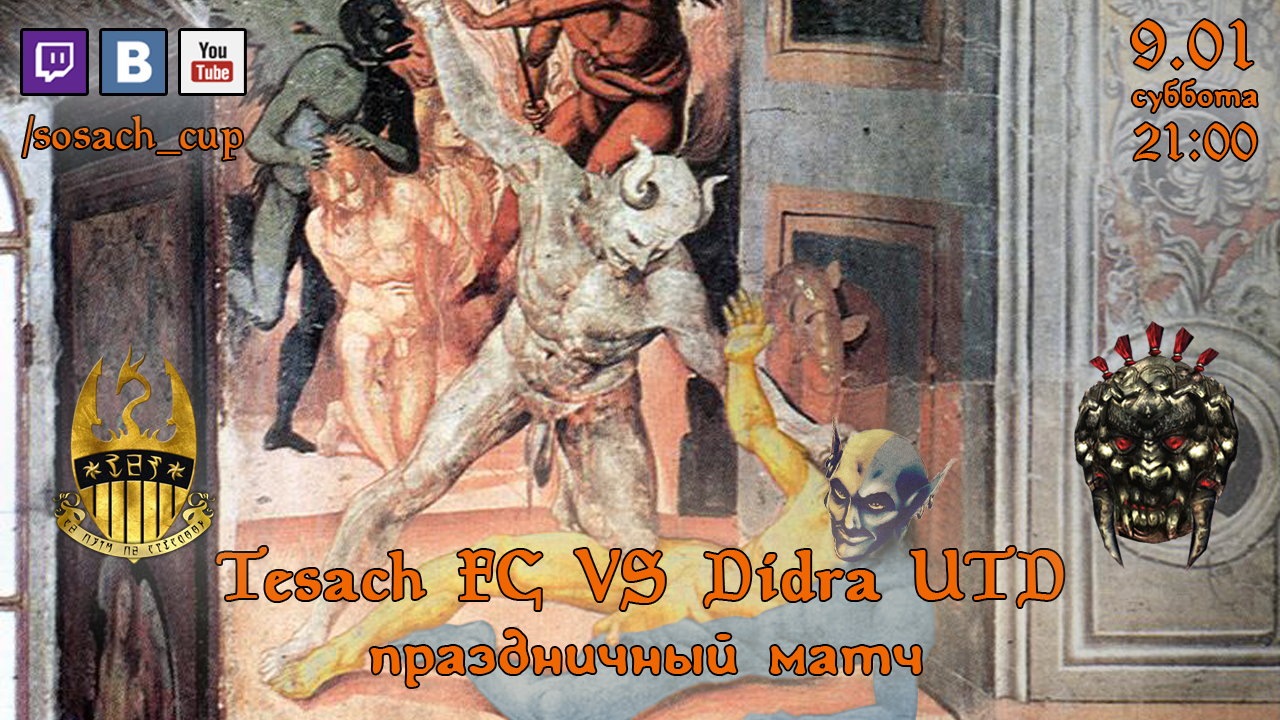 Принцы Дийдра, разгневанные игрой Тесача, открыли врата Забвения в Сосач Лигу, что бы преподать урок футбола смертным и ложным богам. Не пропустите поединок Тесача и Дидра Юнайтед в эту субботу ровно в 21:00 на нашем канале http://twitch.tv/sosach_cup