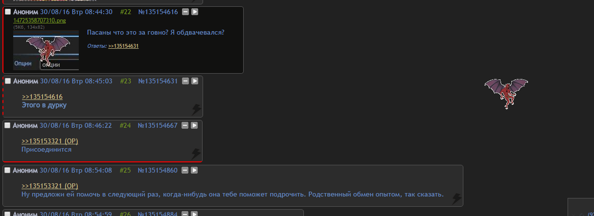 >>50159 (OP) Не знаю куда здесь писать, ибо с дашчана сижу. Но всё же попытаюсь. Абу. Я конечно сам виноват что создал на дневном. Но это не повод разводить вакханалию в б. Уберите уже этого ебанутого вайпера, он каждый мой тред засирает со скоростью света. И ладно бы он хоть как то выражал свою позицию, но он тупо вайпает без остановки. Нафига я вообще тогда пасскод у тебя покупал? А може это ты вайпаешь? Устакань этого долбоёба я тебя прошу. И модеров усмири, они тоже берега путают, банят не пойми за что, из каких то своих личных умыслов. Так не должно быть. Я в их жизнь не лезу, и они пусть не лезут в мою. Ничего я не разжигал и не навязывал никому своё мнение, а законов так уж тем более не нарушал. Может у вас среди модеров вайпер завёлся? Так пусть скажет чем я ему насолил так. Невозможно общаться в таких условиях, невозможно.