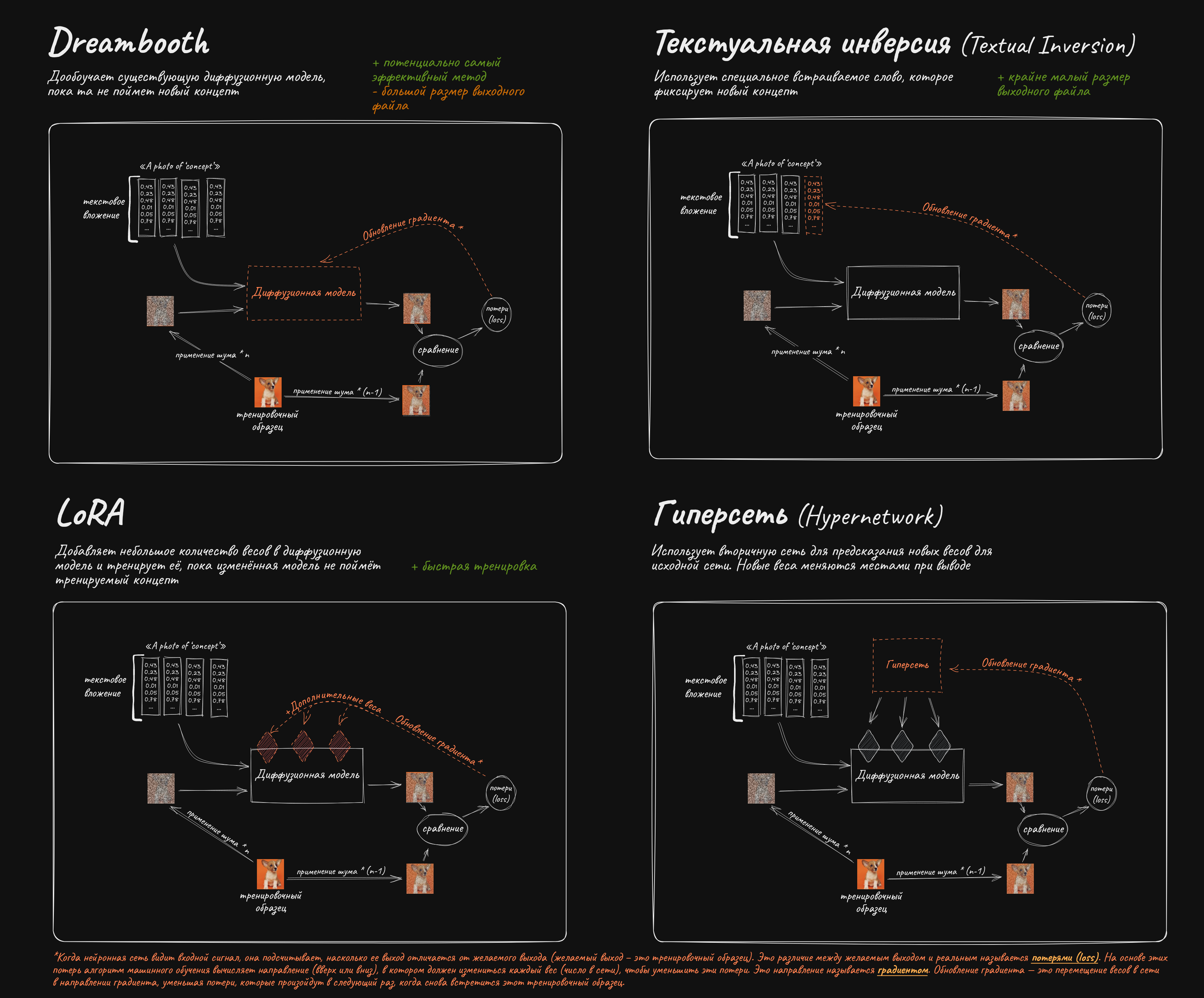 ✱ Текстуальная инверсия (Textual inversion), или же просто Embedding, может подойти, если сеть уже умеет рисовать что-то похожее, этот способ тренирует лишь текстовый энкодер модели, не затрагивая UNet: https://rentry.org/textard (англ.)