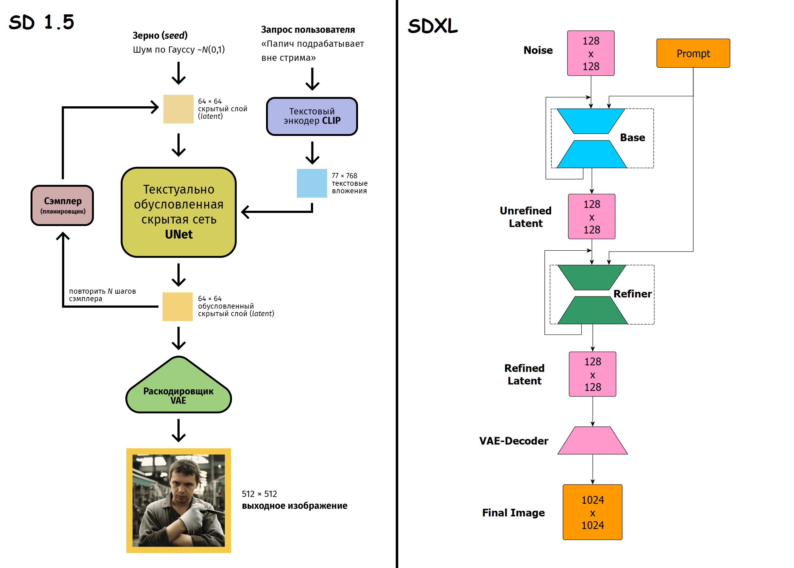 ✱ LoRA – "Low Rank Adaptation" – подойдет для любых задач. Отличается малыми требованиями к VRAM (6 Гб+) и быстрым обучением. https://github.com/cloneofsimo/lora - изначальная имплементация алгоритма, пришедшая из мира архитектуры transformers, тренирует лишь attention слои, гайды по тренировкам: https://rentry.co/waavd - гайд по подготовке датасета и обучению LoRA для неофитов https://rentry.org/2chAI_hard_LoRA_guide - ещё один гайд по использованию и обучению LoRA https://rentry.org/59xed3 - более углубленный гайд по лорам, содержит много инфы для уже разбирающихся (англ.)