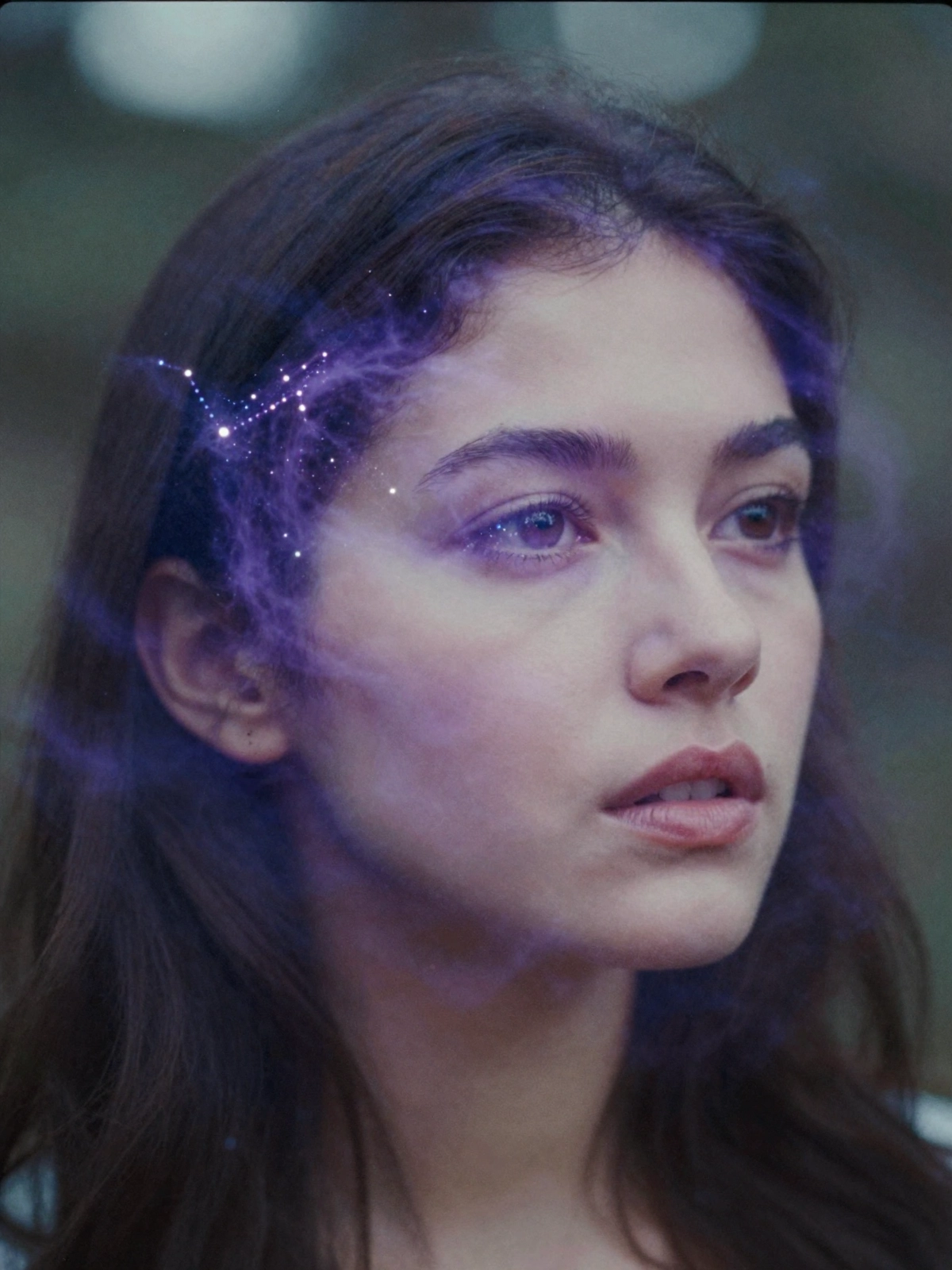 >девочка 9 лет. Похоже, она принадлежит к цыганской расе и представлена в молодом возрасте. У девочки длинные, ярко-черные волосы, ниспадающие каскадом на плечи. она в волшебном мире кружащегося снега и огня. на ней маска из перьев