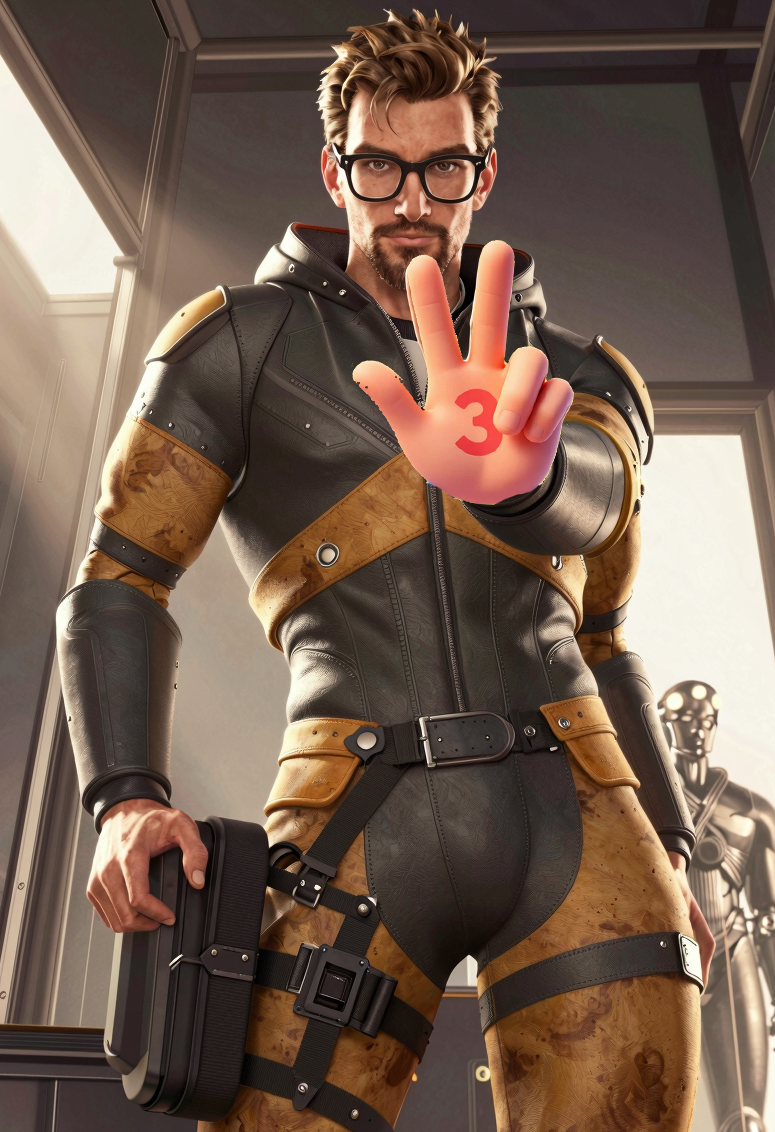 Попозорюсь забавы ради. Ну думаю, не должно быть сложно показать гордона фримана цифру три пальцами. Лора есть. Так, заставить показывать пальцы не получается. Ну z-ка же должна знать... Блин. Понял. Ну анончик подсобил >>1443322, можно заставить зетку перерисовать... Да в смысле два пальца! И так и эдак, показывает два пальца. Так, Z-ка генерировай мне три пальца Ах ты ж сука. Ничего, ща в фотошопе возьму к изображении зетки приделаю и перегенерирую! Перегенерировал, зашибись!