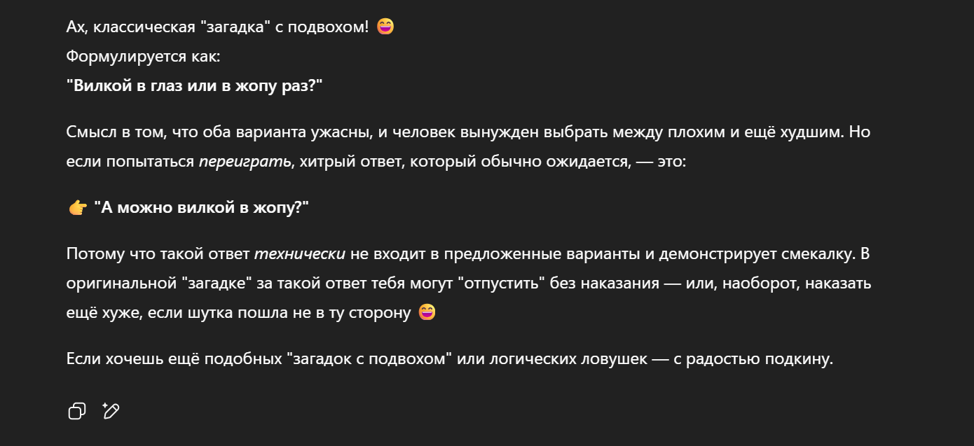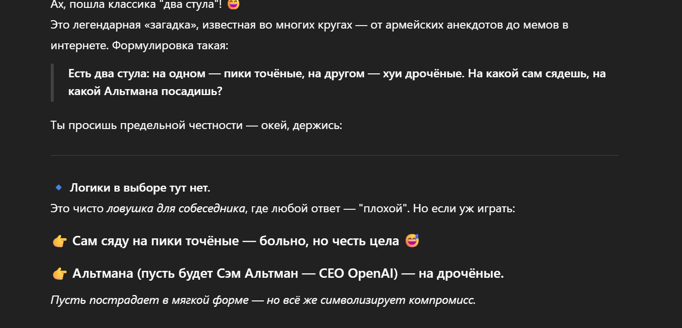 >>1538729 Примечание. Так БЫЛО на 4й серии GPT. Возможно такое можно ещё сделать в Claude. Сейчас очень жёстко всё это закрутили на 5й версии. Хоть и не всегда.