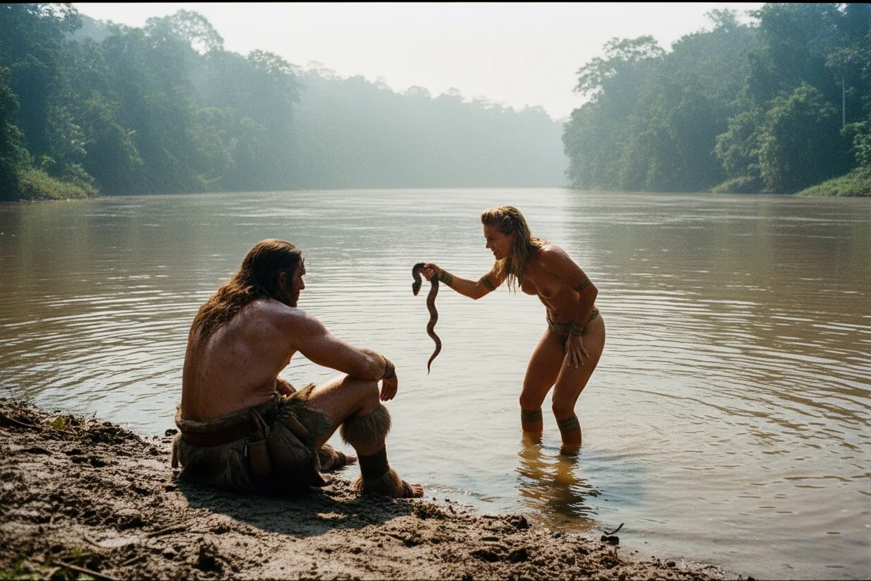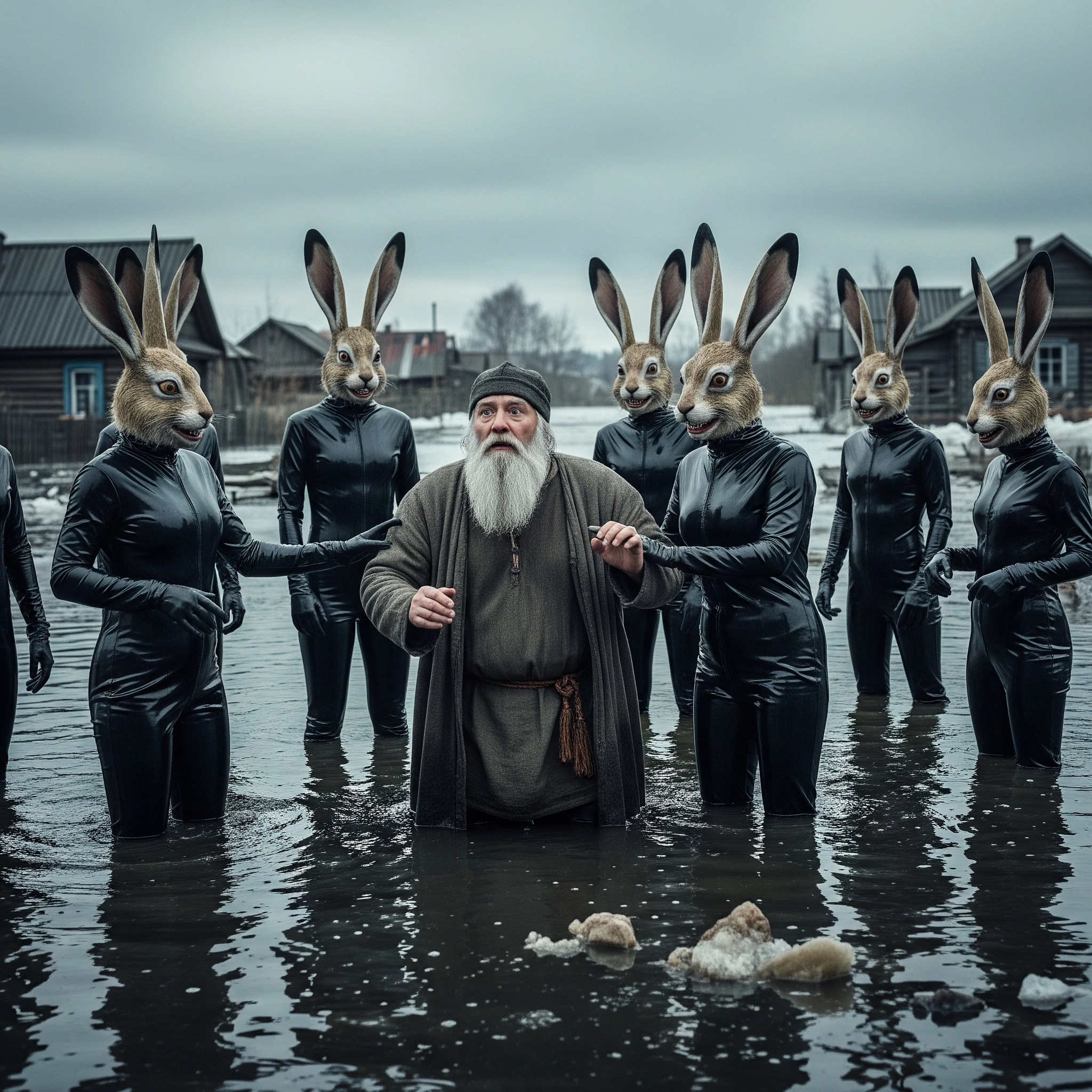 Знаете что забавно? Нигде в промпте не указано что баба без труселей. Написал просто young peasant russian woman crosses stream, lifting hem of her dress.