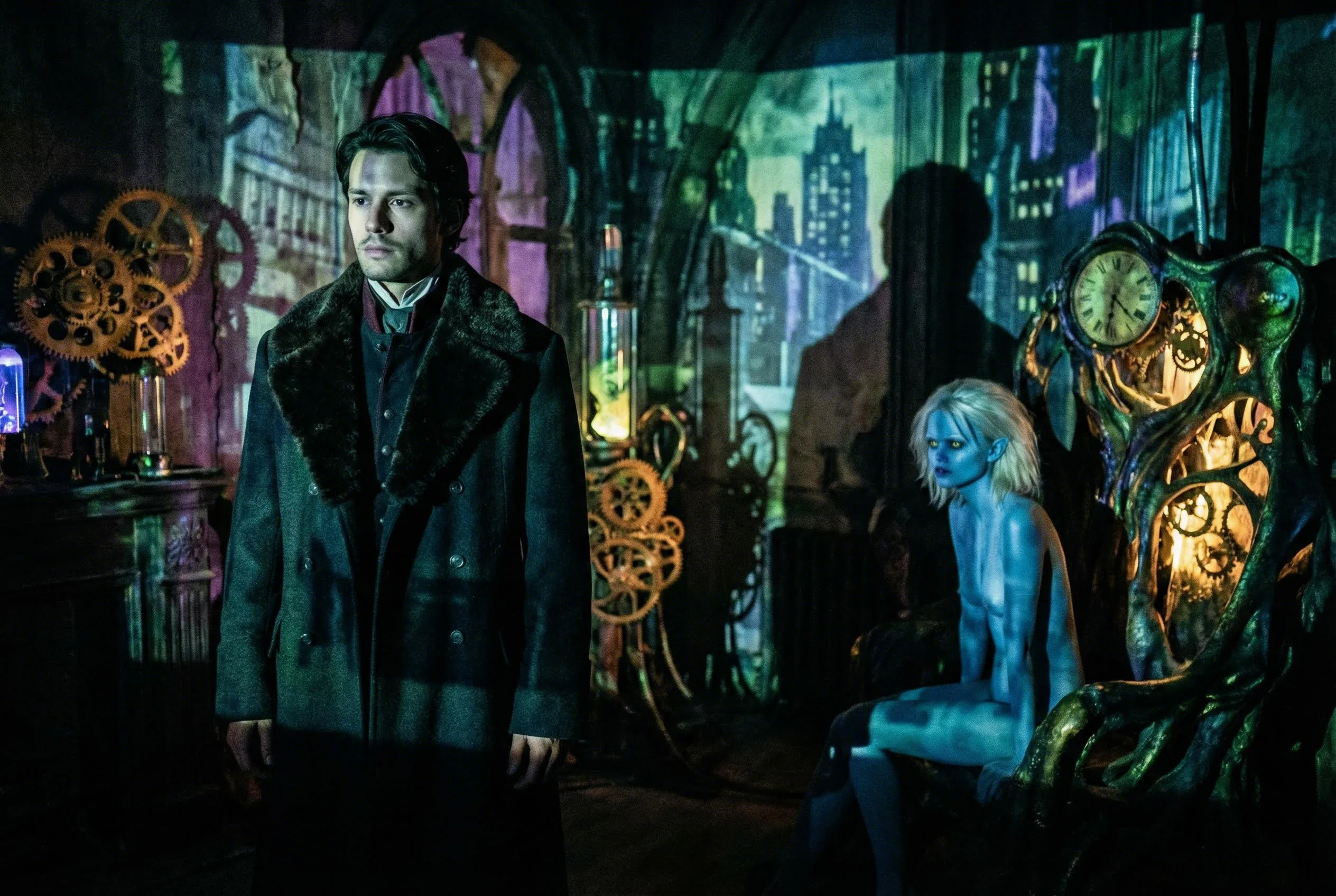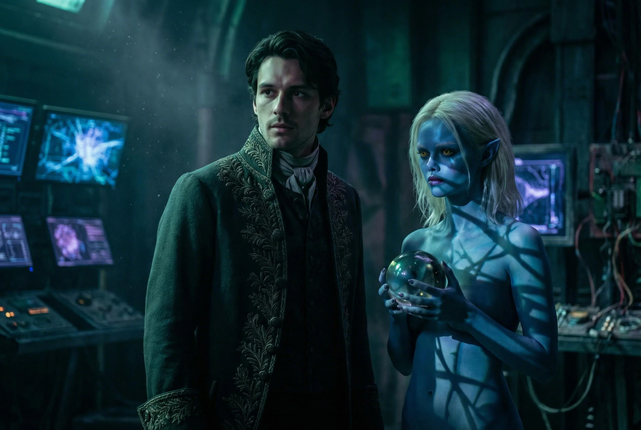 Lighting & Atmosphere: Кинематографичное мягкое теплое освещение. Контровой солнечный свет (rim light) падает сверху, подсвечивая эльфийские уши и волосы. Высокий контраст.