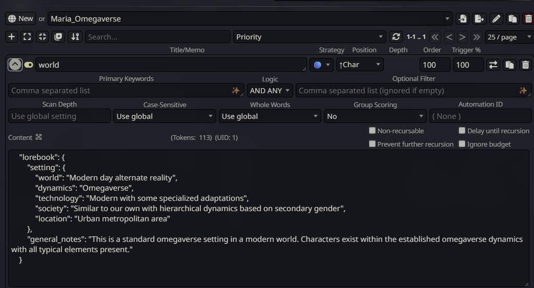 >>1471980 >>1471982 У меня в секции сеттинга в основном описание отношений между фракциями, плюс есть отдельная секция-инструкция, как бы говорящая лоботомиту "избегай спавнить то-то и то-то", никаких локаций и сторонних персонажей не упомянуто. То есть получается у меня там инфа, которая нужна по сути всегда, значит и правда можно обойтись без лорбука. Спасибо за ответ. Карточку, конечно же, не выложу.