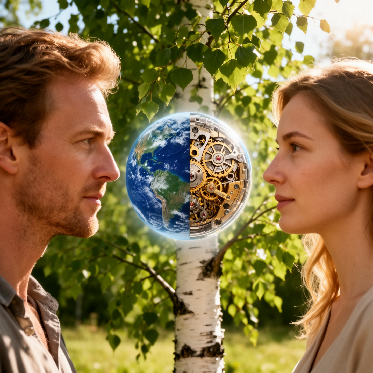 A close-up shot depicting a Caucasian man and a Caucasian woman looking at each other. There is a spherical object hovering between them in the centre of the image, left half of the object is Earth, right half is an intricate clockwork mechanism. There is a birch tree with lush leaves in the foreground. Sunny day. Cinematic lighting. Hyperfocal, deep depth of field.