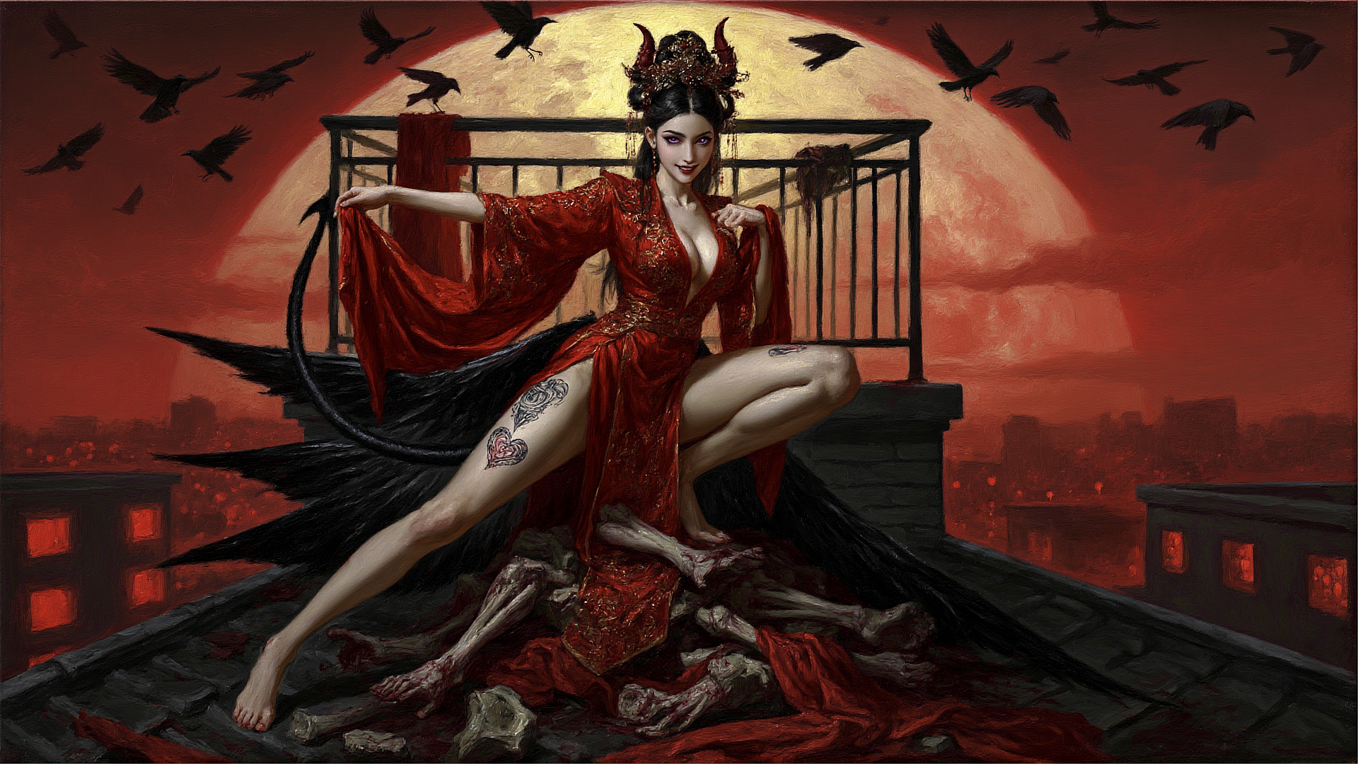 A slender, fair-skinned young Asian nun is crouching on a rooftop with her legs spread in an M-shape. The girl is lifting her black long skirt with one hand. She has silvery-white long hair, white eyebrows, and sky-blue pupils. The girl is smiling with a lewd gaze directed at the camera. Her face is Asian, coldly beautiful, and exceptionally gorgeous. The girl is very tall, with large breasts. Behind her is the rooftop railing. She is wearing a black-and-white sexy fetish nun outfit, with a long black skirt that covers her feet and the area between her thighs. The black skirt is completely soaked, and all her clothes are drenched in sweat, making the wet nun habit semi-transparent. The front of the nun habit is open, revealing her breasts. She is barefoot. Her long, straight white hair flutters slightly in the wind. The background features a blood-red sky, with a group of pigeons near the nun and a flock of black crows flying in the sky. Strong sunlight shines from above, creating a high-contrast backlit silhouette. The nun’s cap is completely soaked. The girl has a succubus heart tattoo on her thigh.