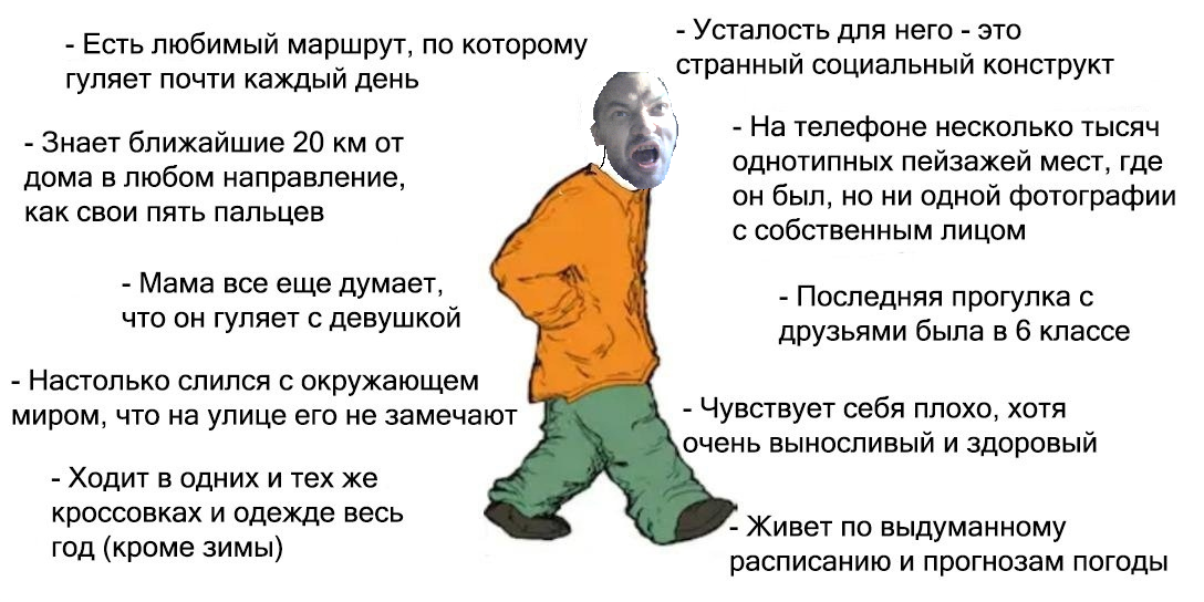 >20километров туда и 20 обратно ходил с позапрошлом году что ли с батязавром+дядьём двоюродным ровно 20 км\дядя по техе смотрел. Ну что тут сказать - банально охуел. У меня здоровья уже не хватает видимо на такое. Хотя по городу я бы и 10 наверное не прошёл\либо все лавочки/остановки начал собирать. Всё таки лес даёт какую-то мне силу или забытие что ли. Легче оно как дышится, так и дрыгается там. Но сорокет я уже не пройду. Сегодня вот постоял, обратно уже на две ноги хромал\как ваще дополз хз.