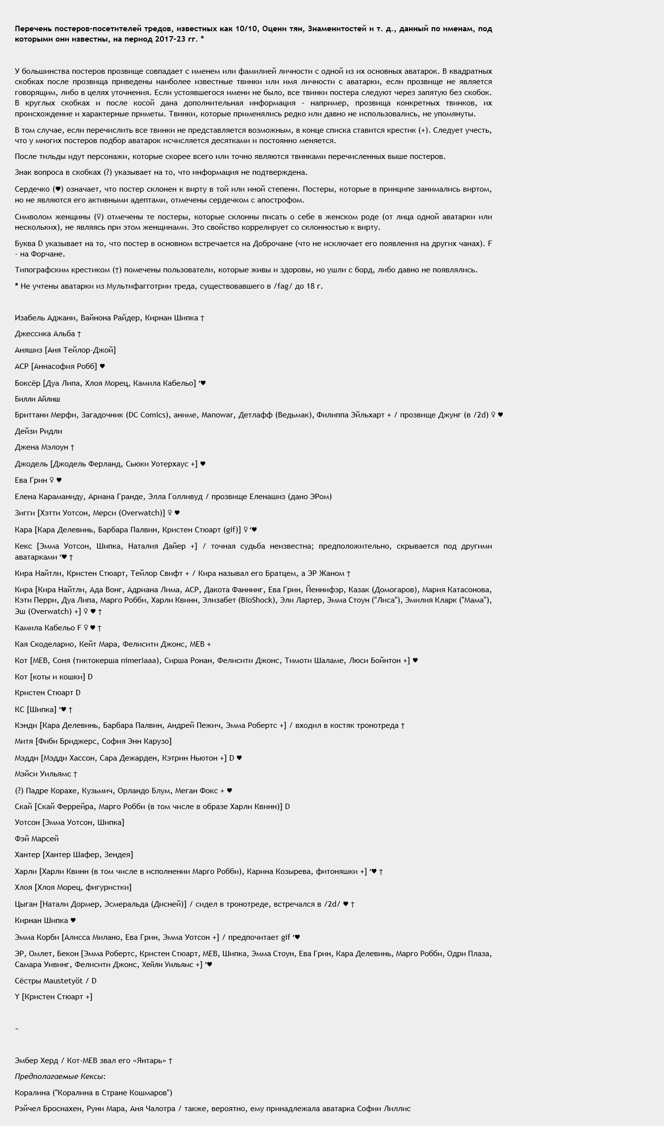 >А он возьмет и подождет, пока ты сам придешь к нему в логово. Ох щи... Ну и пускай себе ждет сколько ему влезет. >Мне кажется, что человек, о котором мы говорим, имеет доступ ко всем разделам, в которых мы собираемся. Но во всех, кроме фаговского, ему остается только смотреть и мириться с объективной реальностью, нравится она ему или нет. > Скорей это просто излишнее рвение. Это многое объясняет. Но странно, что тамошний тредовладелец совмещает свое рвение с беспокойством из-за малолюдности и малопостности. >Примерная цена уже установлена? Или обратишься к услугам оценщика? Как тебе постов... десять А это надо поторговаться и подразжечь желание отдать свои дыни в добрые руки! >Кстати забавно, что ты назвал первого постера "Хотти". А разве не Хотти? По-моему, постер той веснушчатой милахи всем известен именно под таким именем. >А АСР отделил от Шипки. Я слышал и другие версии происхождения Шипки. Не знаю, которая из них правдива, поэтому мне удобнее считать ее совсем отдельным персонажем. >А ведь в 24 паразиты не были такими кусачими, как сейчас. Но зато кожа у аватарок сейчас очень толстая, так что прокусить ее могут только самые злые давители. >Как? Откуда информация? Или это ты так приложил его конкурентов? С тобой он, кстати, делал это под аватаркой, и вряд ли бы обрадовался, что ты рушишь его отчаянно поддерживаемую легенду, в которую больше никто кроме него самого не верит. У них у всех один стиль. Совпадение? Может быть. А может быть, Глазун настолько влиятелен, что сумел создать вокруг себя целую культуру безаватарочного постинга, в основе которой лежит его почерк. Не знаю... >Какие такие истории ты бы хотел от него услышать? Любые, и чем более давние, тем лучше. Особенно меня интересуют легенды о временах до большого срача. И главное - принадлежность аватарок, без этого восстановить события прошлого не получится. >Глазунчик не герой-любовник и не разведчик, скорее просто сибарит, который жаждет, чтобы вирт сам приходил к нему в руки. Однако он регулярно и активно сидит в тредах, а значит он застает почти все происходящее. Как и ты, кстати. >Не для Эрика. Для модератора. Но это один и тот же человек! Наверное, к сожалению. >Боюсь, что Джокера мы потеряли и тред снова станет тихой (почти что мертвенно) гаванью До тех пор, пока туда не придет кто-нибудь из соседних тредов, а они от этого персонажа отличаются мало. >А потом на примере Мэдди мы узнали, что вести алкодневничок в треде не стоит. Оу, пьяненький и мягенький Мэдди - это, наверное, очень мило! На это представление я бы однозначно посмотрел. >Да там и разворачивать не надо было, он сделал их верными хранителями авторского права на свою коллекцию пикч. Нет, ну это уже слишком. Аватарка должна радовать глаз. >Я просто хотел сказать, что Маргот и есть тот "шизик", который пришел на смену Уотсону. Так он какой-то заслуженный и тредообразующий олд? >Лесная Эмма? Мы точно про Стоунса говорим? А теперь запутался я. В моем представлении лесная Стоун и Стоунс - это совсем разные представители фауны. Просто Стоунс давно уже на виду, и я не видел, чтобы он фыркал и йифкал. И мне сложно представить, что он так резко и кардинально сменил формат своего присутствия. >Слушай, так это правда был Лиллис. Уау. Ну тогда понятно, отчего - и на кого - именно он злится. Значит это был не розыгрыш...