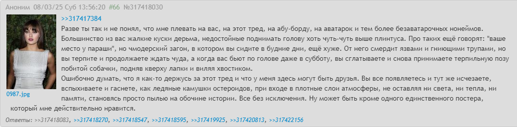 >>3992549 >Просто я выделяю несколько наиболее ярких конфликтов в истории треда: первый - вокруг перекатов в ковидные времена (20), второй - это война с Ваней (23) и третий - затяжной срач между Эром и Боксером, который вытек из предыдущего конфликта (24-25). Первое я, кстати, не особенно считаю за часть плохих времен: как-то сравнительно гуманно все было, что ли, со вкусом и изюминкой... А потом - да, сплошняком поперло то самое, плохо пахнущее и не нужное никому, кроме пары не желающих отступать постеров и нескольких безаватарочных хулиганов-провокаторов но мне их тоже жалко, потому что эти интересующиеся нами могли присоединиться к постингу знаменитостей, если бы нездоровая ситуация не открыла им деструктивный путь для развлечения и самовыражения. >Ты, вероятно, говоришь об одном из последних двух... Или же вообще их не разделяешь. Для меня это то затухающий, то вспыхивающий, но все же единый и непрерывный процесс движения в самую толщу помойки. >Ну ты же не из тех, кто так легко прогоняется? Да и бан в фаге наверняка истечет через пару дней. А чтобы не скучал, буду периодически подкармливать тебя чем-нибудь сладеньким и питательным! Мой срок должен был уже давно закончиться. Наверное, стоит попытаться вернуться и посмотреть, прогонят ли меня снова. Попробую когда-нибудь, когда будет время и повод встрять в чью-нибудь болтовню. >Я вот например совсем не понимаю Боксера, который свои обидки возвел в принцип и демонстративно не заходит туда, будто легитимизируя идею, что фаг - это эр, а эр - это фаг. Хотя может он тоже думает, что тот модератор. Его можно понять, если вспомнить, что в свое время ЭР прямо и безапелляционно запрещал ему туда приходить. >Я там вообще не появляюсь. Прилично фажику в таком признаваться? Ну... Там обсуждают знаменитостей. Наверное, именно поэтому я туда заглядываю примерно раз в год. Но разве это плохое место? >Побочные? Я сразу представляю себе треды аналогичной направленности - оцени тян, лучшая фигура для девушки... Но я вообще-то говорю о самых разных тредах вообще, где зачастую можно встретить всяких интересных людей. И не обязательно ассоциированных со мной лично, кстати. Нет-нет, я про наших, разбредающихся по всему b и пасущихся, например, в треде у Ани или в совсем случайных тредах, где они начинают постить аватарки, чатиться и устраивать балаганчик. А еще про самопроизвольные вытекания из загонов посреди недели. >Он над этим долго и старательно работал, уважь человека! Рад за него, не рад за всех остальных... >Просто Джокер пока что еще не настолько съехал с катушек, но, кажется, движется в том же направлении. Он явно не в себе, если он не притворяется или отыгрывает намеченную роль. >И лично в моем рейтинге самых отвратных типов он оставляет всех шизиков асулима далеко позади - тут и его повадки, и вкусы, и характер, и даже стиль письма, и полнейшее неуважение к окружающим (хоть и продиктованное, вероятно, отчасти болезнью). Он просто похож на буйного маргинала, только и всего. Меня это совсем не трогает, если не считать его попыток постить селфи. >А может он просто выгорел и совсем потерял ко всему интерес. Ну нееет! Он по-прежнему способен отпускать колкости, значит тот самый и все еще ого-го! >К сожалению, в лисах не разбираюсь. А вот тут >>3992575 написано, что это... ты! Я, конечно, не очень доверяю голосам без аватарок, но мнение такое существу