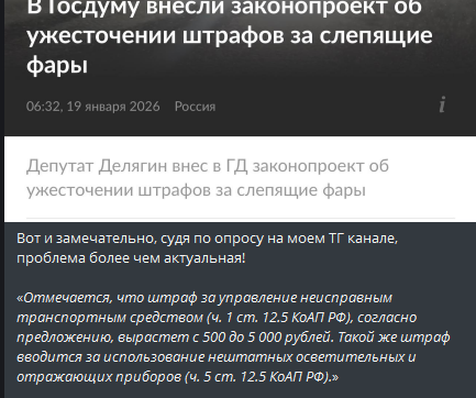 >>6743313 За светодиодные фары предложили штрафовать на 30 тысяч рублей. Аналогично — за шумный выхлоп При этом в Госдуму внесли более мягкий вариант законопроекта В Госдуме рассмотрят законопроект, в 10 раз увеличивающий штраф за езду на автомобиле с рядом неисправностей: речь о нештатных светодиодных или ксеноновых фарах, но не только. Проблема слепящего света, судя по нашим опросам, остро волнует и челябинцев. При этом ряд экспертов сомневается в реалистичности законопроекта и предлагает более радикальные меры — штраф до 30 тысяч рублей и лишение прав. Подробности — в материале 74.RU.