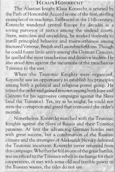 >>1632300 > В Камарилье, если он не просечет вампирства и не вызубрит свою родословную, на что спокойно сиры тратят десятки лет обучения, чтоб не опозориться или грохают тупого птенца, ну его не выпустят или сожрет новоиспеченный папка. Ну такое, конечно, нужно обсуждать с сторителлером, но я и хотел для этого персонажа некоторый конфликт с сиром и кланом. Его бы с старта скорее терпели бы из полезности и возможно пытались всячески подтянуть к традициям клана, а возможно и просто устранить как недостойного, это уж от самой истории и других персонажей игроков будет завесить.