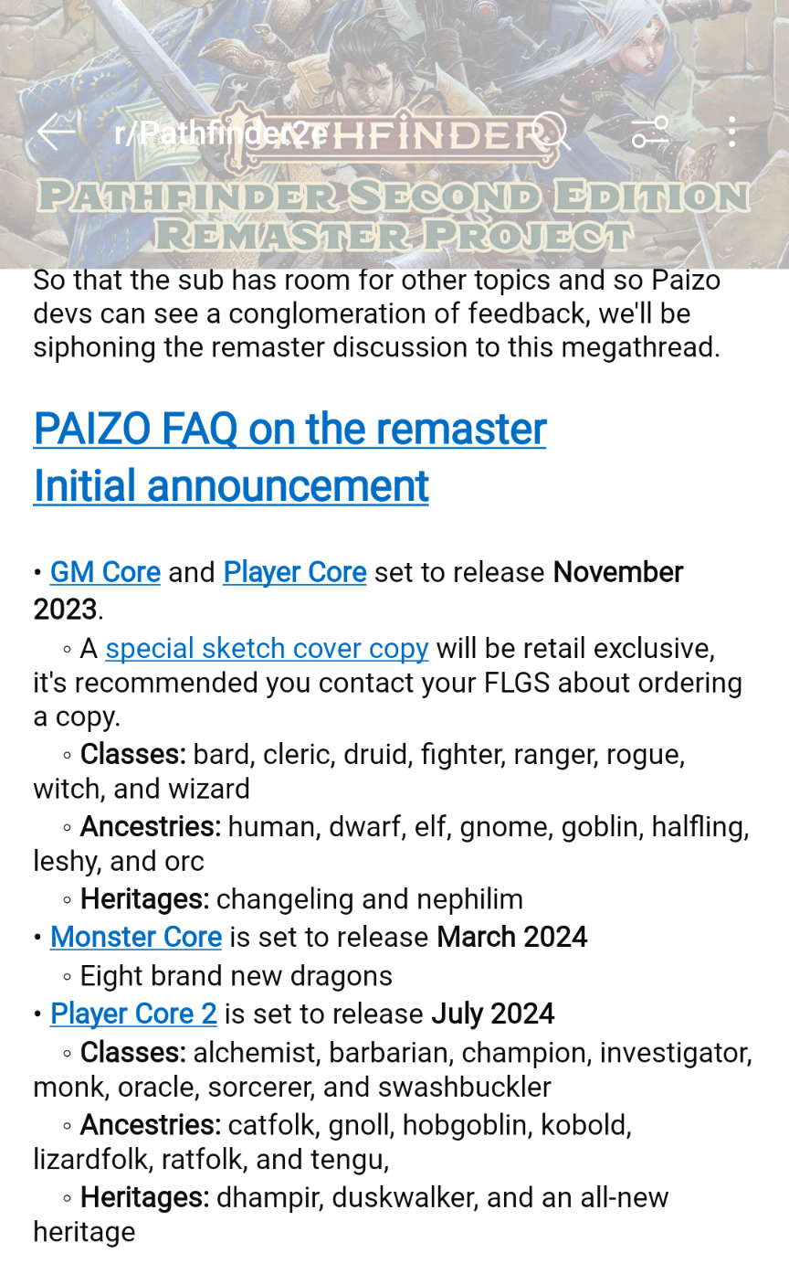 >>1619907 Ремастер совместим с обычным ПФ2, так что и к ремастеру, и к обычному ПФ2. А классы выйдут в новом дополнении-событию War of Immortals, где Голарион лишится одного божества (вроде говорят про богиню).