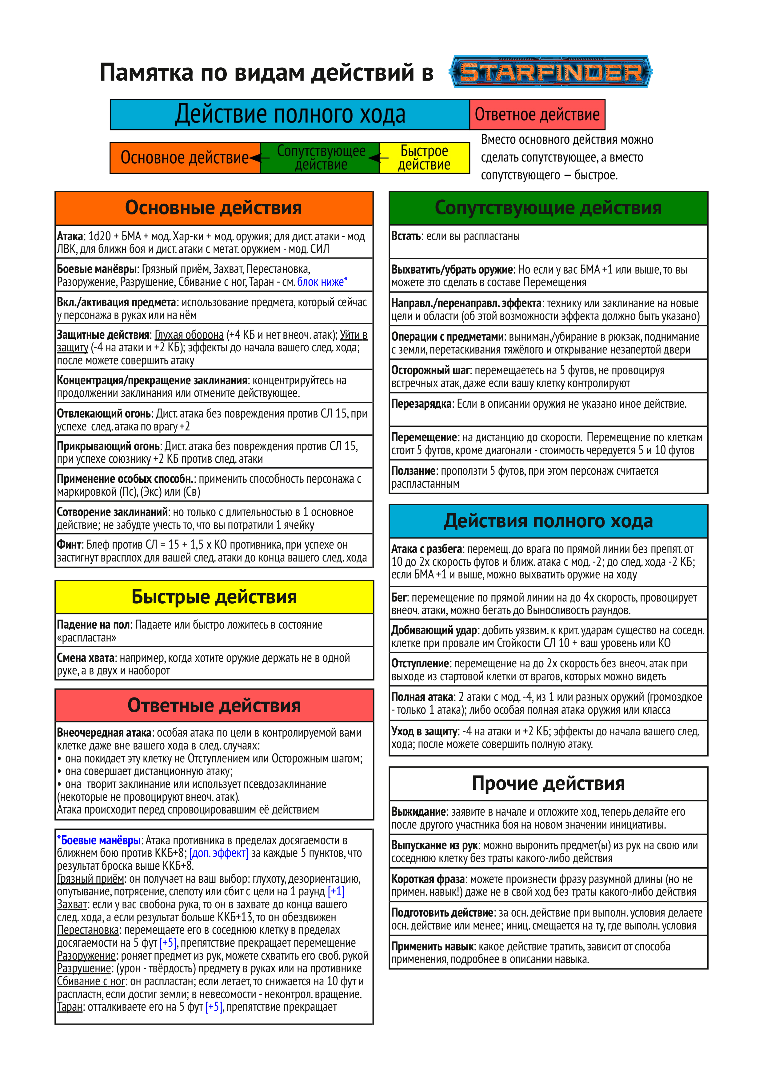 Starfinder: Официальная вики с правилами на английском: https://www.aonsrd.com/ Подскажите модуль для новичков, но не стартер: "В неизведанное" (рус.) и Starfinder Society S01-03 - Yesteryear’s Truth (англ.) Для играющих по официальному переводу: на сайтах издателя лежит огромная эррата с исправлениями текста и цен. Первый Starfinder 2e Field Test: https://downloads.paizo.com/Starfinder_Field_Test_1.pdf