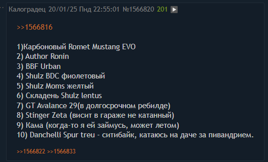 Даже не фоткаю давно. Тут какой-то шиз периодически репостит схороненые мои древние фотки фиолетового и желтого шульца и тролит вас. Если что, это не мои велы вообще были, я их просто кастомайзил, фиолетовый бдк для подруги, жёлтый мамс для кореша, после модернизаций вкидывал по несколько фоток в треды, их какое-то ебло насхороняло буквально все и пытается вам подрывать пердаки, дебичи.