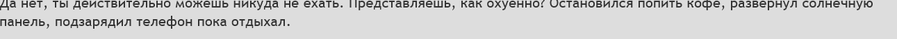 >>1607820 Да нет, ты действительно можешь никуда не ехать. Представляешь, как охуенно? Остановился попить кофе, развернул солнечную панель, подзарядил телефон пока отдыхал.