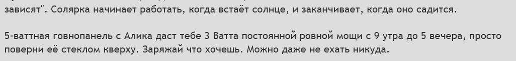 5-ваттная говнопанель с Алика даст тебе 3 Ватта постоянной ровной мощи с 9 утра до 5 вечера, просто поверни её стеклом кверху. Заряжай что хочешь. Можно даже не ехать никуда.