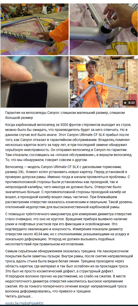 Хотя, вот в целом групсет Wheeltop EDS GeX за 40К+ https://www.youtube.com/watch?v=9iEhj2b2Fmg и SENSAH за 15К https://www.youtube.com/watch?v=YB5RxDNj3Ho ну и аликал-звезда Sunshine https://www.youtube.com/watch?v=t5R8mqhlfSg И всё б/м работает, если пересобрать, хоть и не очень чётко https://www.youtube.com/watch?v=7KCwvaIgPUg Но. В итоге имеем игрушку на дорогом групсете с рамой начального уровня, которые весят не меньше и едут нисколько не лучше дешёвого всесезонного китай-шимано за 20К на алюме 11,5кг, зато вдвое дороже, капризнее и геморнее в обслуживании. Я предпочту обычный надёжный и недорогой в обслуживании алюм-грэвел за ту же цену с регулируемым выносом и нормальной посадкой, не страдающий расслоением кареточных узлов в мороз, и гнутыми петухами, который будет наваливать не хуже карбон-франкинштейнов и который можно бросить на улице в любую погоду.