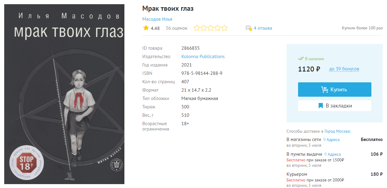 Здесь Масодова нашел Волчек: «Я хотел ее издать немедленно, но на то, чтобы найти автора и получить у него разрешение, ушло два года» [Вербицкий 2002]. Волчек извлек Масодова из патриотически-готического окружения, в котором он висел в сети, и перенес на бумагу: сначала в МЖ (1999. № 59; 2001. № 59), потом вышла первая книга «Мрак твоих глаз» (2001), за которую издательству тут же вынесло предупреждение Минпечати. В предупреждении говорилось об «убийствах, глумлении над трупами», «вымыслах о героях гражданской и великой отечественной войн» и «непристойных сценах, провоцирующих низменные инстинкты». Низменные инстинкты книжка вызвала в заместителе министра печати Валерии Сироженко, чиновнике-юристе при кострах тщеславия. Эту должность он занимал с 1999 по 2004 г. и был если не главным инквизитором в период раннего путинизма (курировал дело о запрете «Лимонки», пытался закрыть газету «Завтра» и т. д.), то главным спикером на подобные темы.