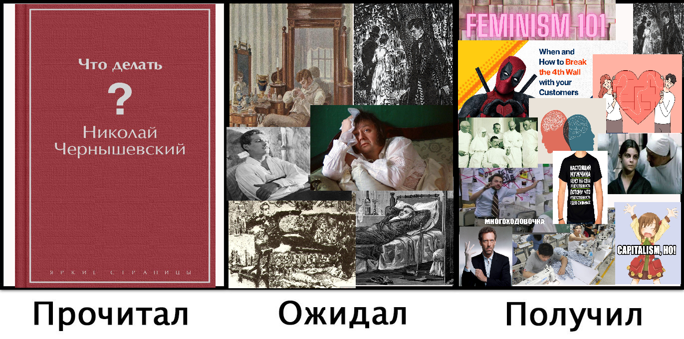 Народ, короче, я тут нашел БРИЛЛИАНТ. Это знаменитая книга Чернышевского "Что делать?". Я ее намедни прослушал, в детстве прочитать хотел, но охуел от убогости стиля. Прослушав первую треть (которую, кстати, хвалят девочки, а от остального плюются), я подумал - ну что за говно, графомань!, а потом вкатился. Короче, вы все могли быть измучены этой книгой. Или нет. Даже мое поколение не заставляли ее читать, потому что установилось мнение, что "Что..." - литературный высер! Я тоже так думал! До этого я читал Доста, Спортсмена, Толтача, французских классиков слушал в аудио-вариантах. Последним был Флобер с "Воспитанием чувств", где был противный Синекакль-республиканец, который убил работягу и простого хорошего парня Дурасле, там была продажная феминистка, отдавшаяся хуемразям, и все, даже республиканцы, вели себя как скотины, да еще это было написано таким языком, который располагал к прослушке. А тут это... Никакой интриги, да и интрига с первой части сделана хуево (в рамках книг того времени). А уж оджин из сюжетов - "ударим по мещанству народническим кружком кройки и шитья" - вообще пиздец! Да, в пересказах буквально представляют все так! Но когда я одолел первую мутную треть, я понял! Это новаторский роман, уникальный для своего времени. У Чернышевского в основном одни существительные и глаголы, т.е. "он пошел", "она нагнулась" и в таком духе. Графоманы и филолухи любят Стивена Кинга с его мантрой "меньше прилагательных", кто-то любит за это старика Хэма. Интрига у Черныша с убийством-самоубийством раскрывается ближе к концу. В начале хитросплетения любви разрешаются очень мирно и здраво, но потом закручиваются. Персонажи-функции, на которых жалуются девочки, таковыми не являются. Когда Вера Павловна после исчезновения мужа общается с Кирсановым, то ее истерика показывается, а не описывается (что тоже новаторство Чернышевского, но именно в сценках, которые буквально состоят из диалогов). В.П. буквально говорит в начале каждого предложения: "Хи-хи, ха-ха", т.е. у нее тихое помешательство. Но Черныш не был бы писателем своего времени, если бы не говорил с читателем. Т.е. не он сам, а рассказчик, который, в старой традиции, является одним из героев романа, и с его слов он написан! Рассказчик говорит с читателем, он даже обращается к нему: "Проницательный Читатель". помните Кинга, с его "Постоянным Читателем"? Стиль "Мемуаров о ремесле" чисто Чтоделательский. И он его подъебывает, говорит - ты думал, что будет вот так, а вот хуй! Язык в "Что делать" - разговорный, живой язык своего времени. Даже постоянное повторение слов, которое встречается в самых драматичных моментах - это не графомань, а принцип, им Черныш, когда уже не показывает, а рассказывает, обозначает напряжение, повторения - это рефрен, как в поэзии, но это сложно понять, пока не встретишь второй, третий, пятый рефрен и т.д., чтобы понять - это не от словоблудия, потому что если бы автор был невоздержан, то он не смог бы столь ловко пользоваться всеми своими приемами на протяжении всей книги! Чернышевский похож на Андрея Платонова - такого же мастера "низкого языка", который, однако, умел его применять, умел им дирижировать, умел встраивать его в свою симфонию, в свою поэзию. Это нечто! Я уж не говорю про идеи. Про персонажей, которые вдохновили тысячи героев, которые подражали этим героям, чтобы наша жизнь, моя и ваша, с