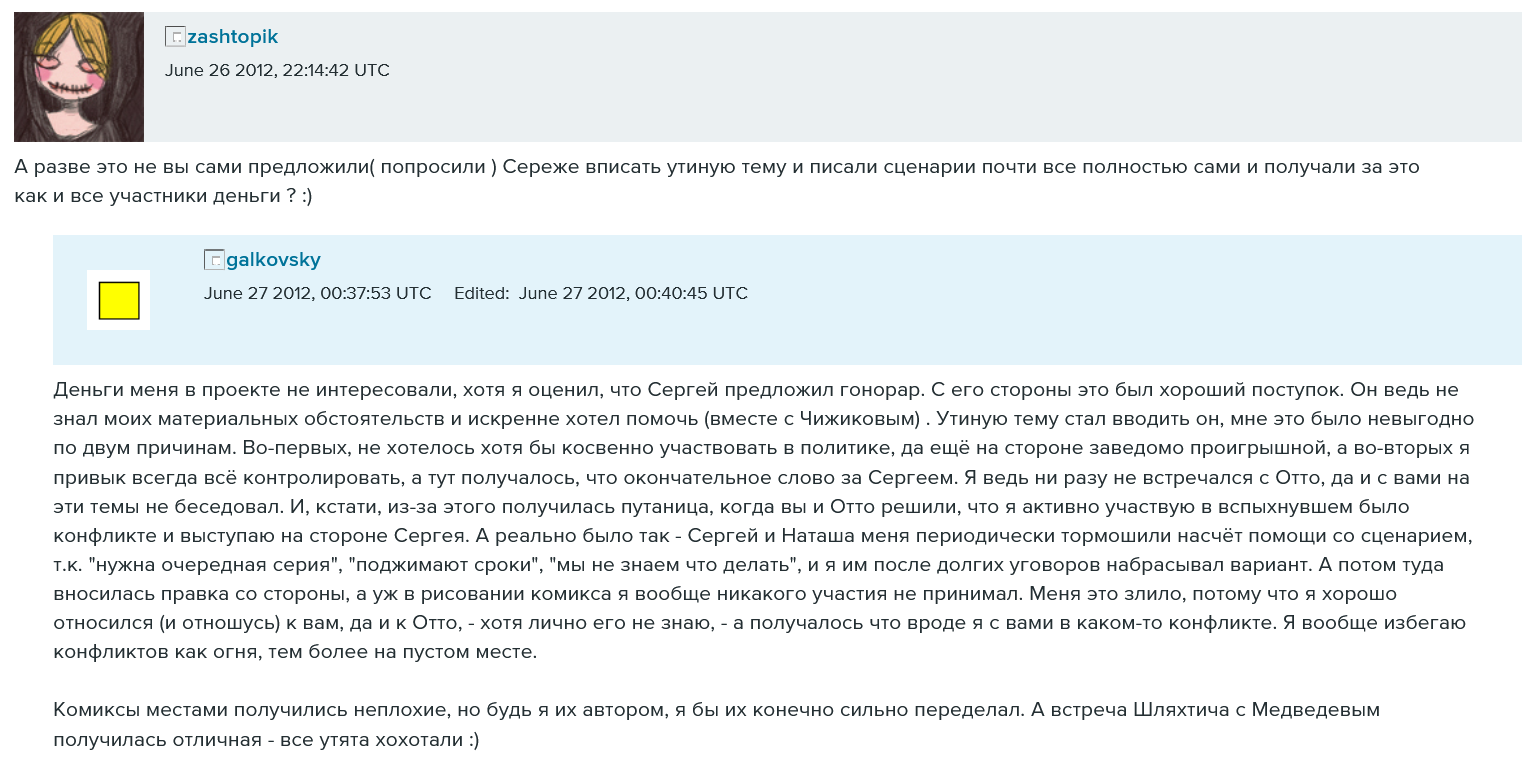 Следовательно, автору пасквиля обидно что обидели веру в учебник истории. Как же так, это же рассказывали в юношестве, когда автор был такой весёлый и жизнерадостный, солнышко так ярко светило, трава была зелёная-зелёная, а тут хрясь по святому, это как вообще, явно Галковский просто чего-то не понял.