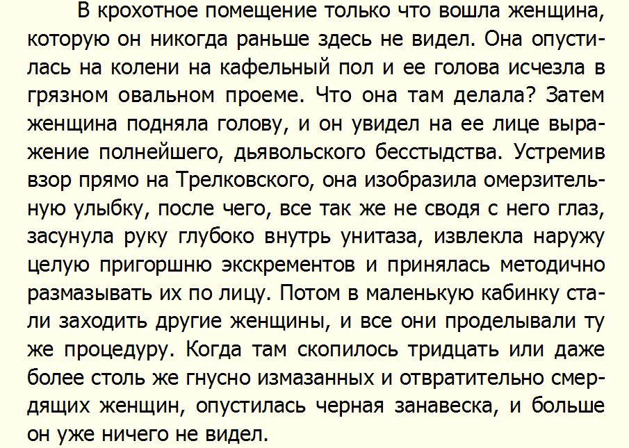 >>1025554 >Это очевидно писалось с целью вызвать у читателя отвращение Нет. Внезапно. Это писалось с целью передачи потока простых мыслей простого реднека, попавшего в непростой замес.