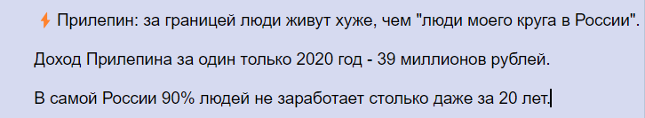с одной стороны понятно, что таков любой "современный писатель", с другой стороны, ну никто это говно не читает, кроме таких же уродов. Прилепин это такая чашка Петри, в которой все выросшее в "литературном мире" тошнотворное заразное говно и мандавошек можно посмотреть и потыкать