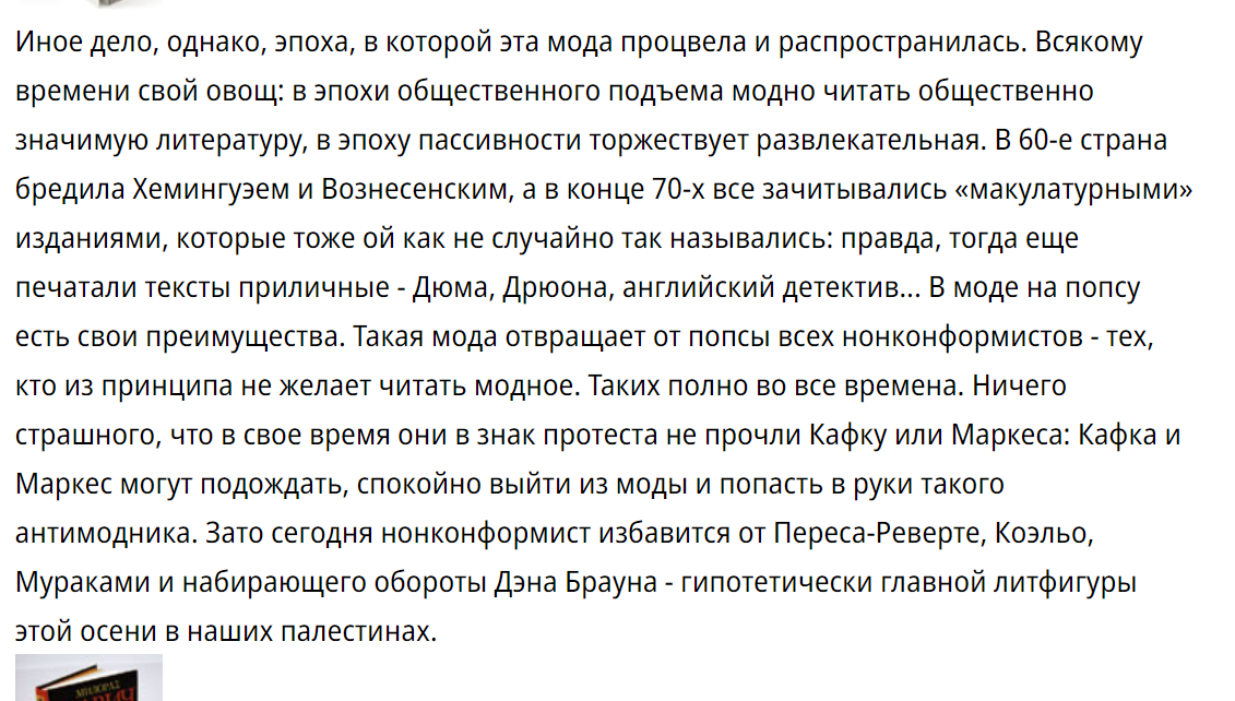 >>897069 У всех по-разному было значит, я помню разделение на "настоящую" литературу, попсу и альтернативу и эти три категории пересекались только на Пелевине. Например, те кто читал Паланика не читал Мураками, но в ряду магреалистов он мог и проскакивать. Еще его читали те, кто больше ничего не читал, скорее всего поэтому о нем и сформировалось такое мнение. Вот тут все расписано как оно было, в конце Быков резко так приложил, но не угадал и Мураками из моды не выходит до сих пор и печатается бесконечными тиражами, а вот кто такой Перес-Реверте я, действительно, даже и не помню https://www.kommersant.ru/doc/2294105 >>897084 >Считаю его и Харуки - средней руки авторами, которые не заслуживают ни хейта, ни топа литературы Так и есть