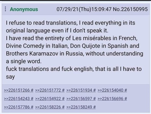 >>983065 >Для чтения Библии и Торы, когда будешь учить языки оригинала? Или фильмы в оригинале когда будешь смотреть (без субтитров, ведь это не очень правильно так делать). > Я смотрю фильмы в оригинале вообще-то. Иврит и латынь я знаю. Ты разве нет? И читал библию в переводе? Тогда мне тебя жаль, крестьянский сын.
