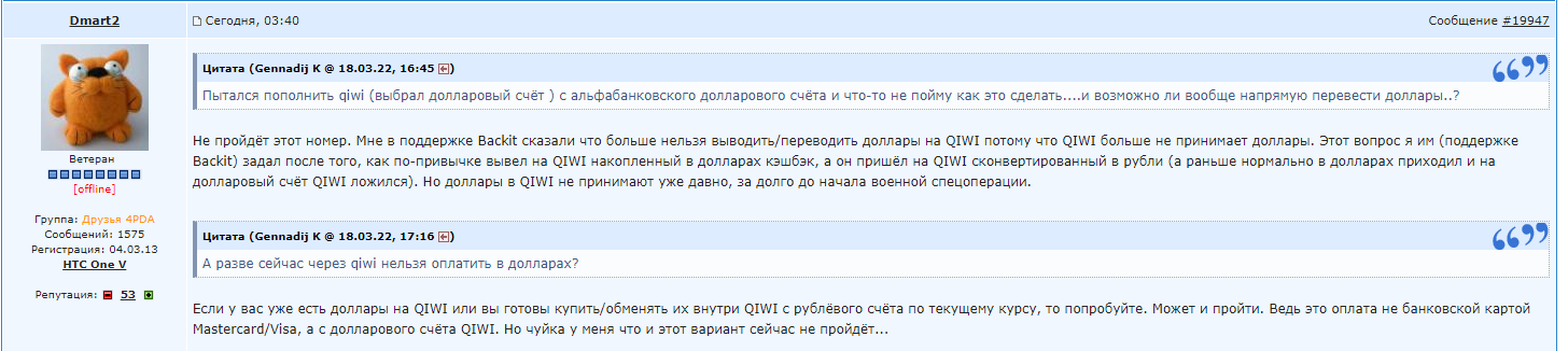 >>119252 > попробуй перепривязать карту Так у меня ее на алике и так каждый раз просят реквизиты с нуля вводить > ну или через киви А как там с возвратом дела обстоят, если что не так пойдет? А доллары с тиньки без проблем будет туда перевести? > правда через них вроде только за доллары можно покупать Это мне и нужно, потратить баксы с карты >>119253 > Так валютные счета на карте не принимают же вроде. Либо рублями с карты, либо валюта через киви. Я этого не знал. Т.е если я на алике выставлю оплату в рублях, то у меня с валютного счета баксы конвертируются в рубли(по курсу али) и оплата пройдет? Или нужно именно с рублевого счета платить?