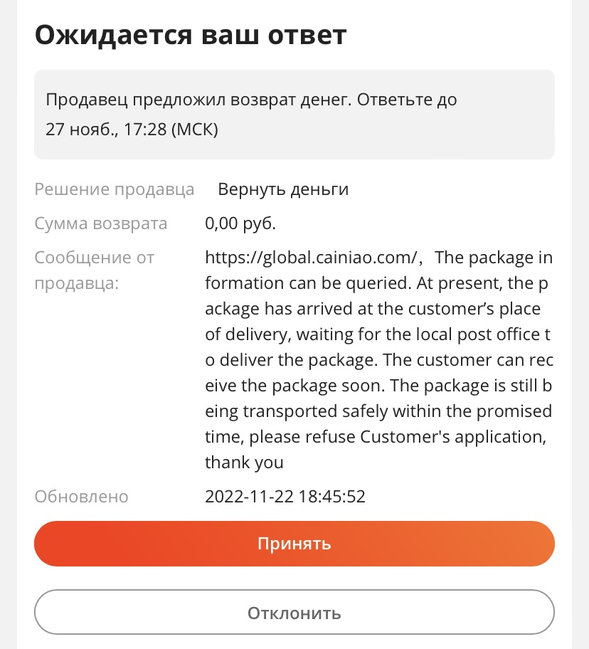 Аноны, посоветуйте, как тут ответить. Заказал на Али посылку, она шла 6 недель. Срок ожидания закончился и я открыл спор как только эть стало доступным. Написал, что посылки нет, трек номер не обновлялся с начала ноября. Мне эта посылка уже не нужна, пока ждал - пришла другая с тем же товаром. Ответ продавана - пикрелейтед. Только трек код у посылки не отслеживается по России, откуда он вдоуг знает, что она в отделении (и схуяли я тогда до сих пор не получил извещение). Что ответить так, чтобы отстоять свой спор и вернуть эти копейки?