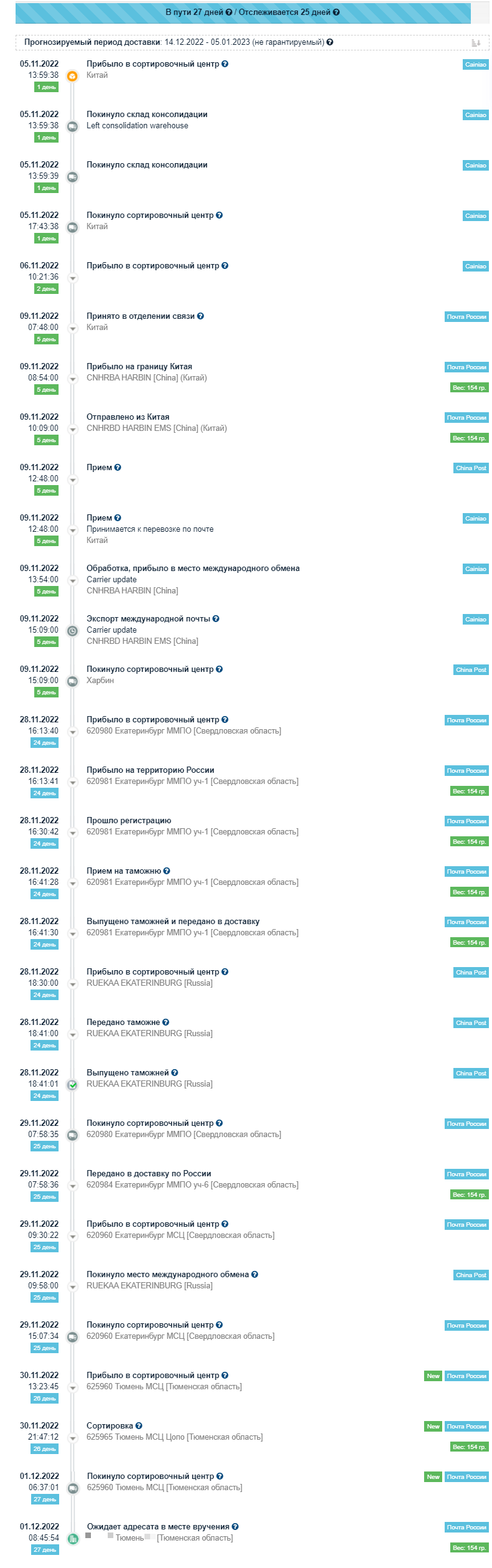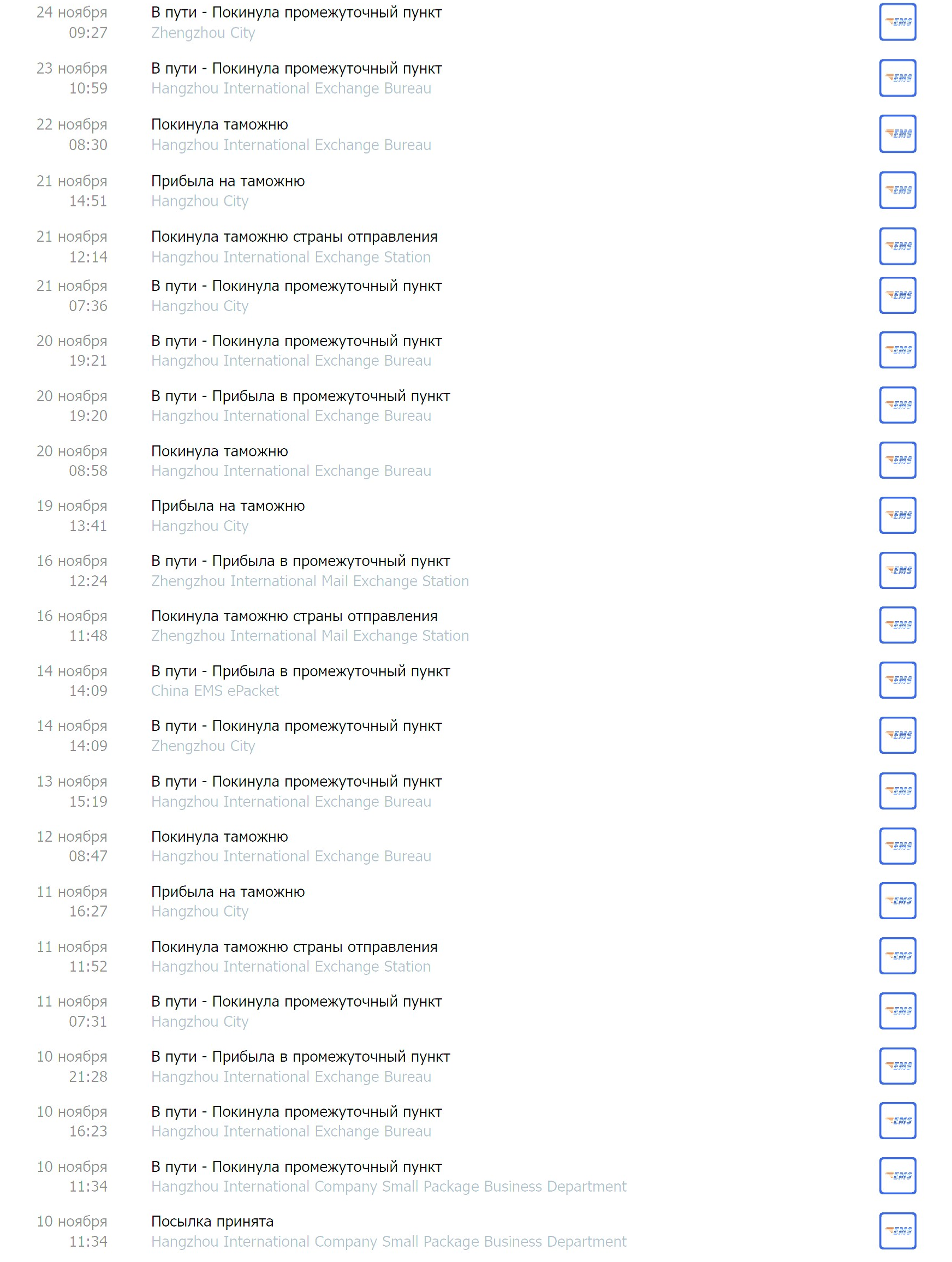 Один-единственный раз посылка прошла через Ебург, и это был единственный раз, когда посылка дошла дней за 10. Все остальное время они идут около месяца в среднем.