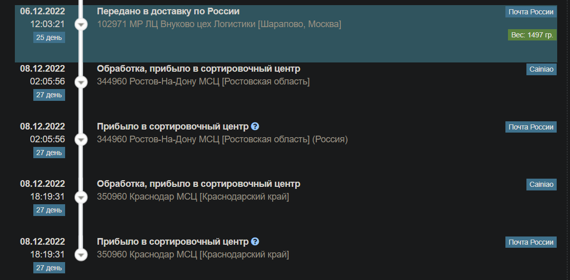 Раньше китайцы дрочили по 2 недели у себя, а по РФ долетало за 3-5 дней, теперь наоборот, ни один заказ не пробыл в китае больше недели и ни один из них так и не дошел с 11 числа.