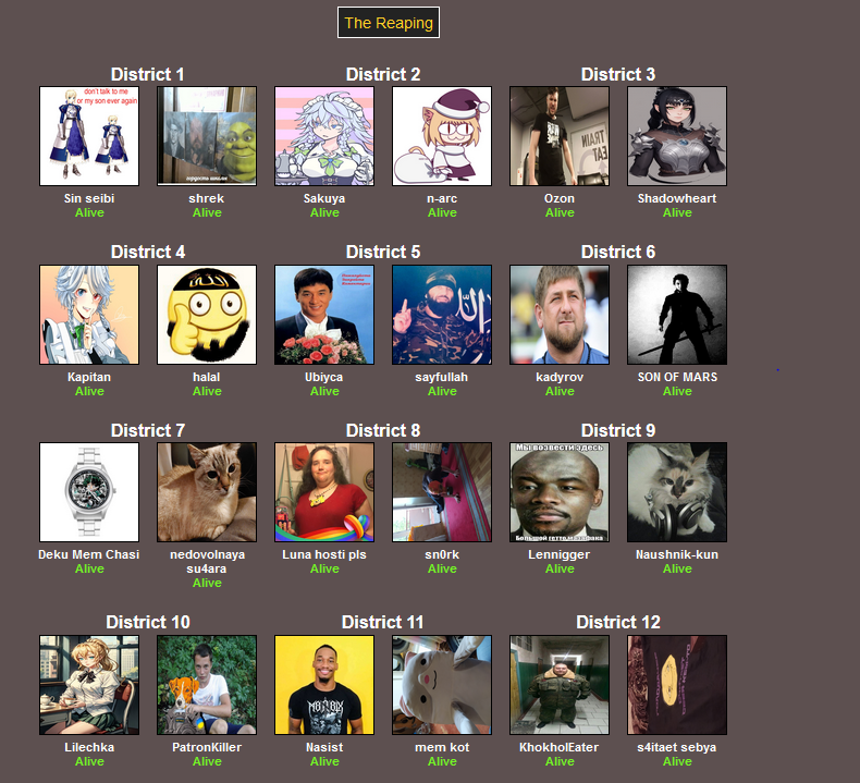 >>1536877 1. Ждёшь, когда хост даст команду на сбор персонажей. Например, как тут >>1536786 2. Вкидываешь в тред имя персонажа + его аватарку, как тут >>1536792 3. Запасаешься попкорном, ждёшь, когда наберётся 24 персонажа на игру в текущих полудохлых реалиях придётся ждать не один день. Затем наблюдаешь за тем, как твой персонаж пробивается к первенству в симуляции Голодных Игр. Ну или скорее получает перо в бочину на первый-второй день. 4. ??? 5. PROFIT!