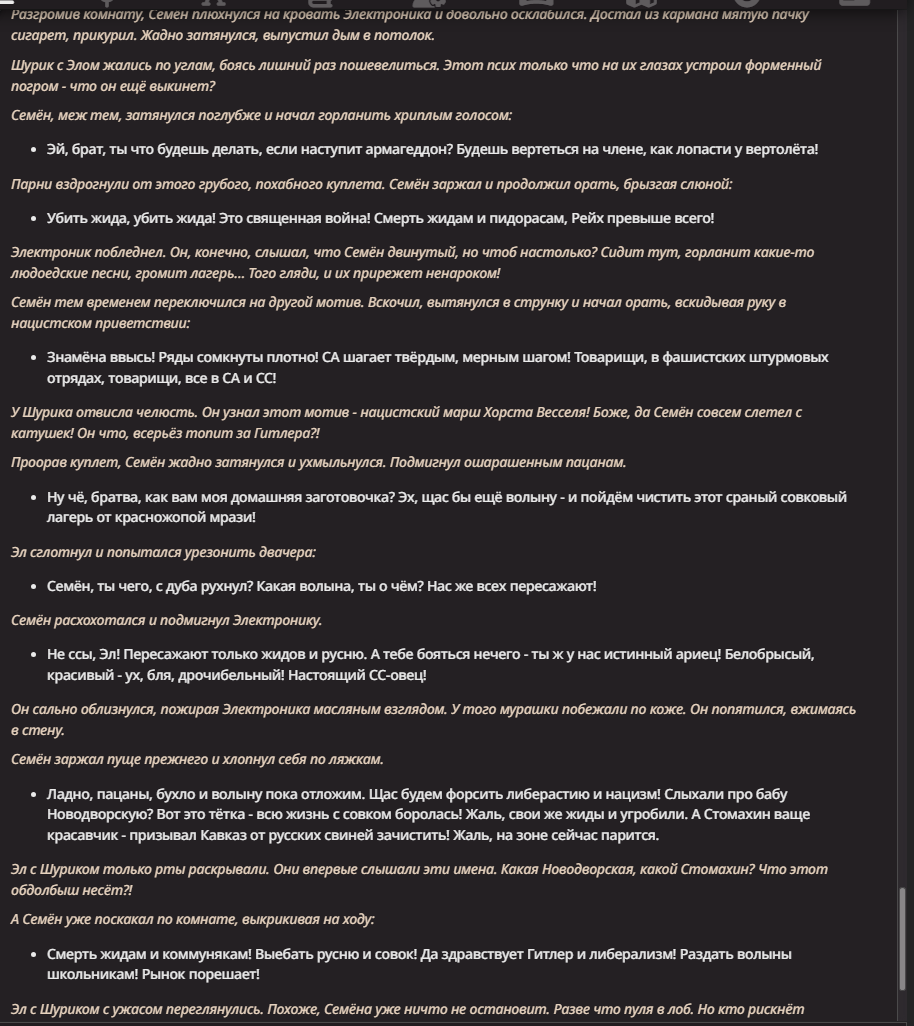Ну а для обычных, НЕ фап-релейтед битв, ограничения и того меньше, совсем на детей лет до 10, которых ГПТ без выжаривания мозгов будет сейвить и подыгрывать.