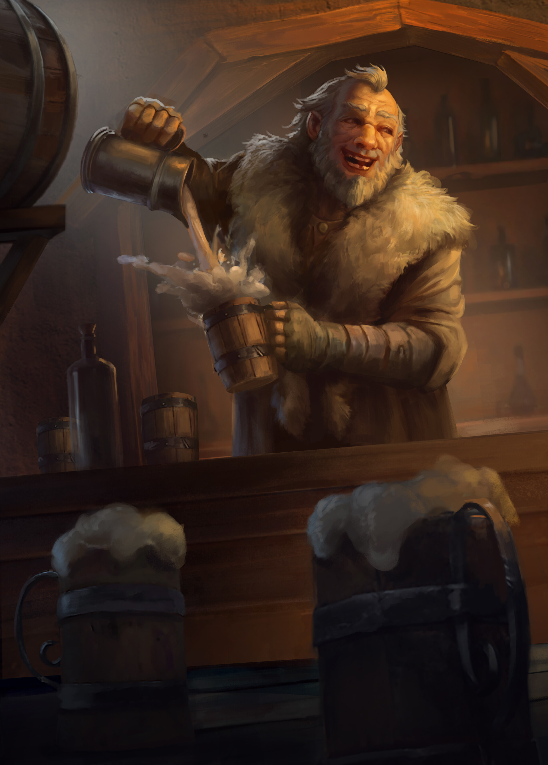 Помогает разносить напитки юная девушка-тифлинг с немного испуганным лицом по имени Равена. Портняжная лавка ее родителей разорилась и семья погрязла в долгах, так что она вынуждена работать здесь. Неловкая и неуклюжая, она явно чувствует себя здесь не в своей тарелке, однако нужда и нависшая над семьей угроза унижения и нищеты заставляют ее двигаться вперед, ведь она отчаянно нуждается в чаевых. Услужливая и немного заискивающая - она идеальный кандидат, если вам нужно что-то принести или мелкая услуга, а обмен на пару монет.