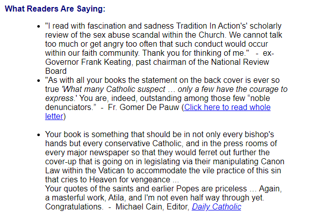 Насчет книги, она очень сомнительная, ее Ватикан видимо не особо признает по комментариям сайта, которую ее продает. То есть она и вышла недавно в 2004, как я понял по биографии Atila Guimarães. Он является радикальным консерватором и в основном критикует нынешний Ватикан за их послабления, ну и что церковь находится в кризисе из-за них. Готов половину Ватикана отлучить если ему власть дать. https://www.youtube.com/watch?v=81j64qvVXSE В видео можно разобрать его тейки